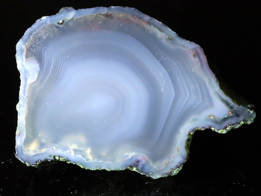 Leštěná polovina achátové pecky s pěkným modrým (obláčkovým) až modro-šedým odstínem a decentní kresbou.