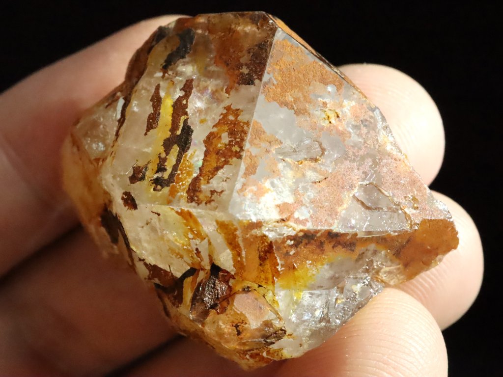 Oboustranně vyvinutý půlkrystal záhnědy s krásnou patinou limonitu