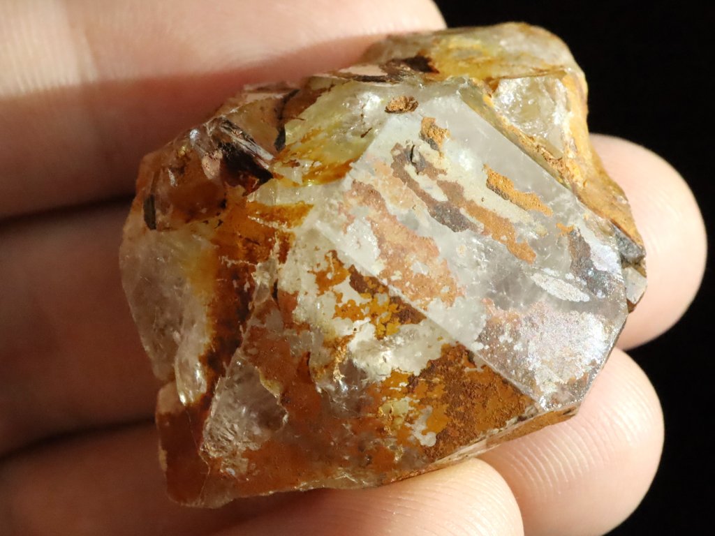 Záhněda má světle kouřový odstín, do značné míry ji však pokrytá slabá krusta / povlak hnědo-oranžového limonitu.
