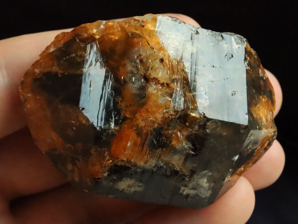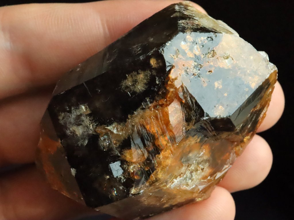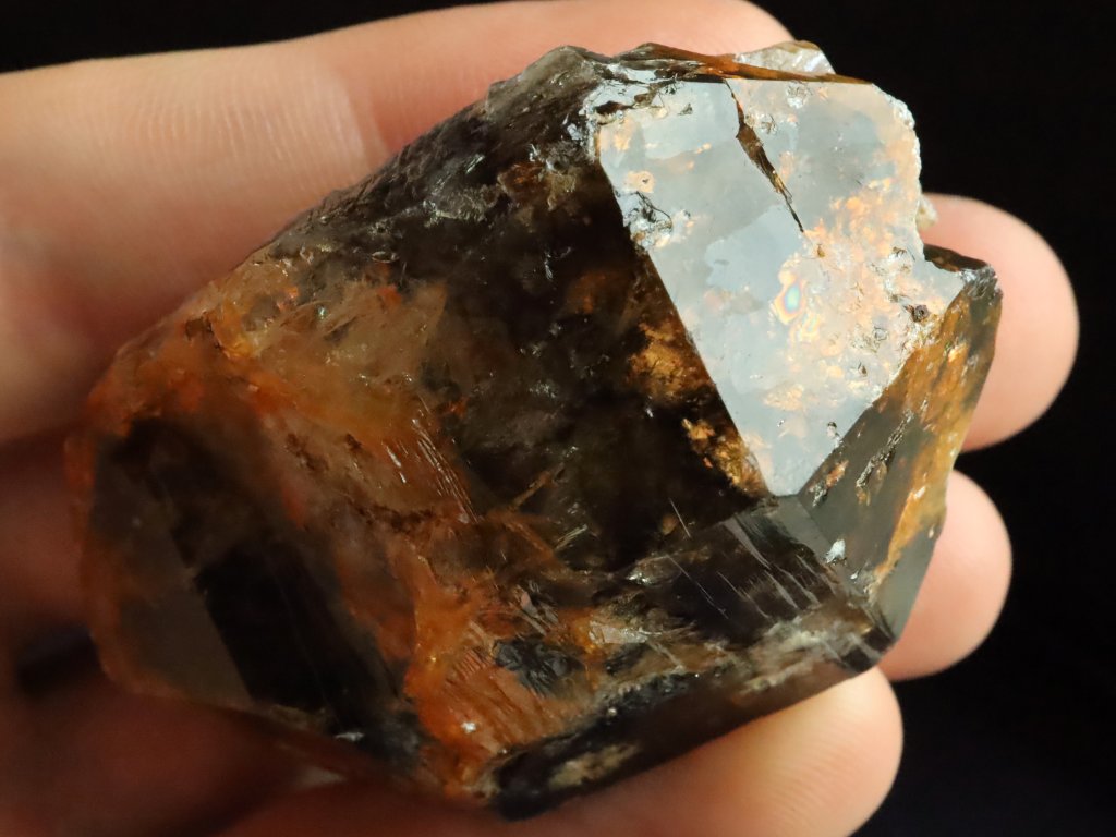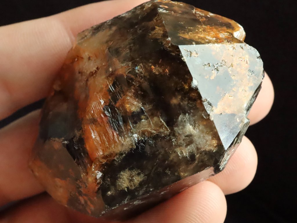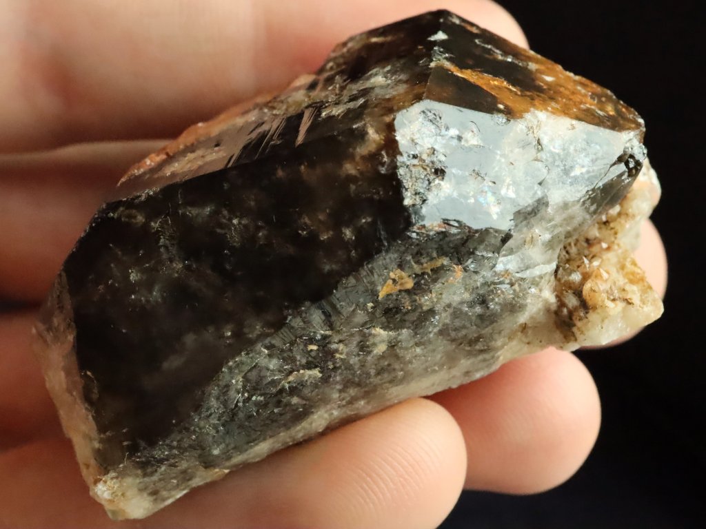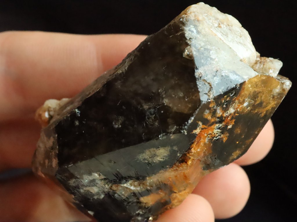 Morion má kvalitní černý odstín, který je místy zajímavě doprovázený oranžovým limonitem.