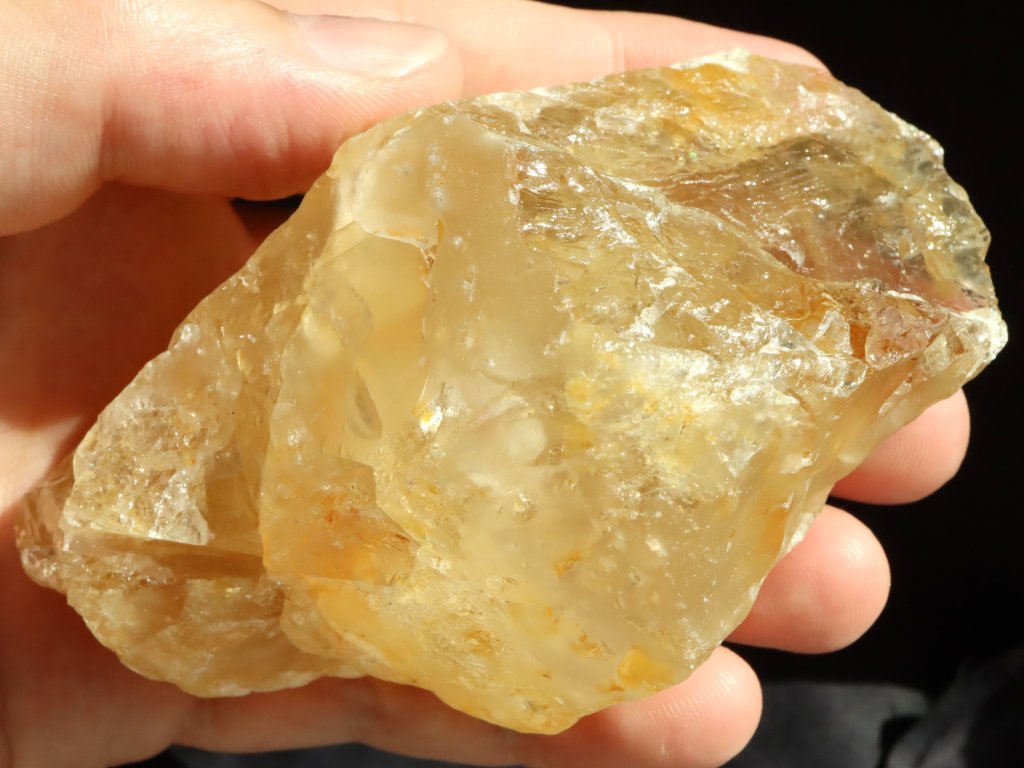 Sluníčkem či baterkou je citrín celý dobře průsvitný, převážně omletý zevnějšek však nedovoluje příliš nahlédnout do vnitřního světa kamínku. I přes to však jednou lesklou pasáží můžete částečně pozorovat větší množství vnitřních úkazů, jako jsou mlhoviny a peříčka.