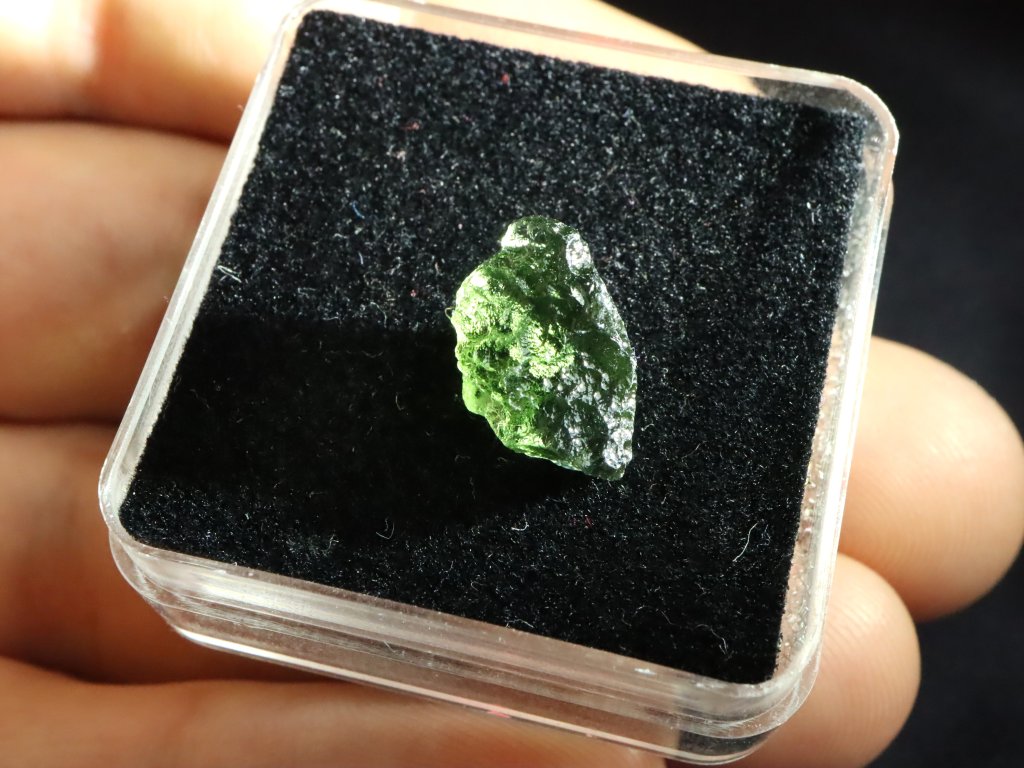 Vltavín obdržíte v kvalitní (hodnotné) uzaviratelné průhledné plastové krabičce s polstrovaným vnitřkem - viz. foto. Kamínek se vám tak nejen nikam nezatoulá, ale zároveň se jím budete moci přes průhledné plastové víčko krabičky i skvěle kochat.