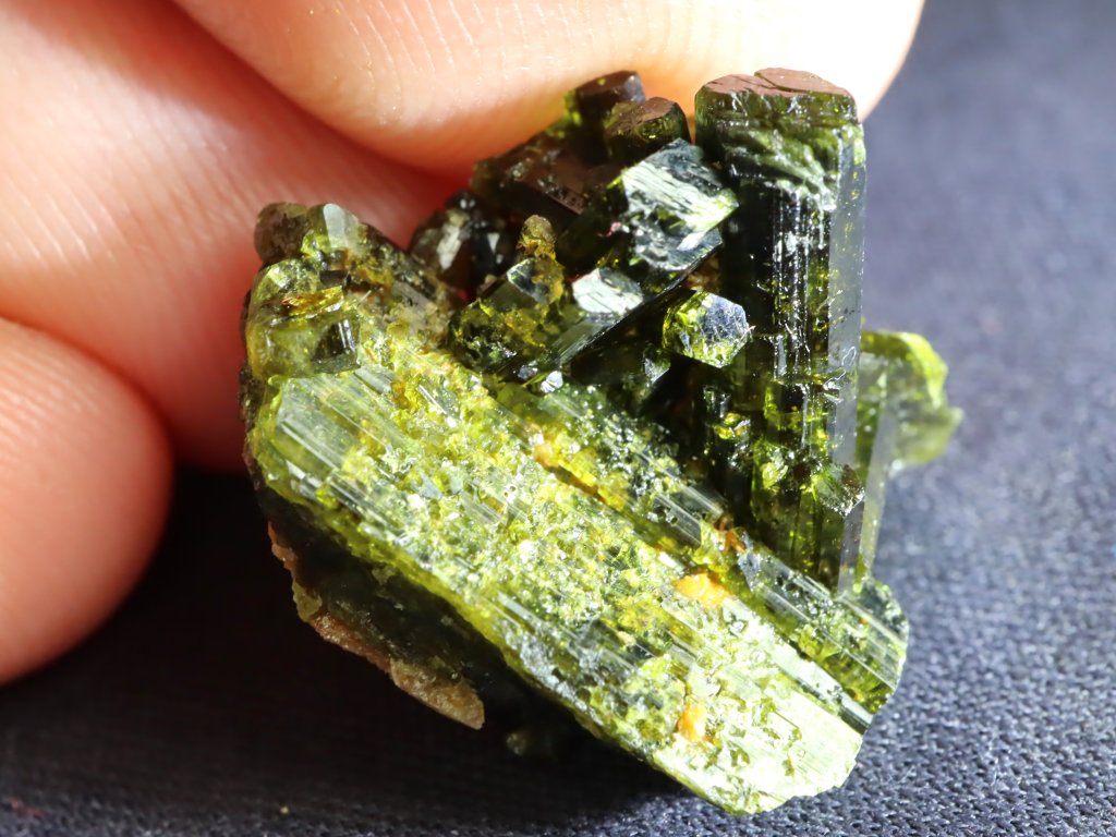 Minerál epidot má na běžném denním světle velmi tmavě / temně zelenou barvu, když jej však nasvítí či prosvítí sluneční paprsky nebo světlo silnější baterky, kamínek se hezky částečně rozzáří podmanivými brčálově zelenými odstíny, místy s jablkovými či olivovými pasážemi.