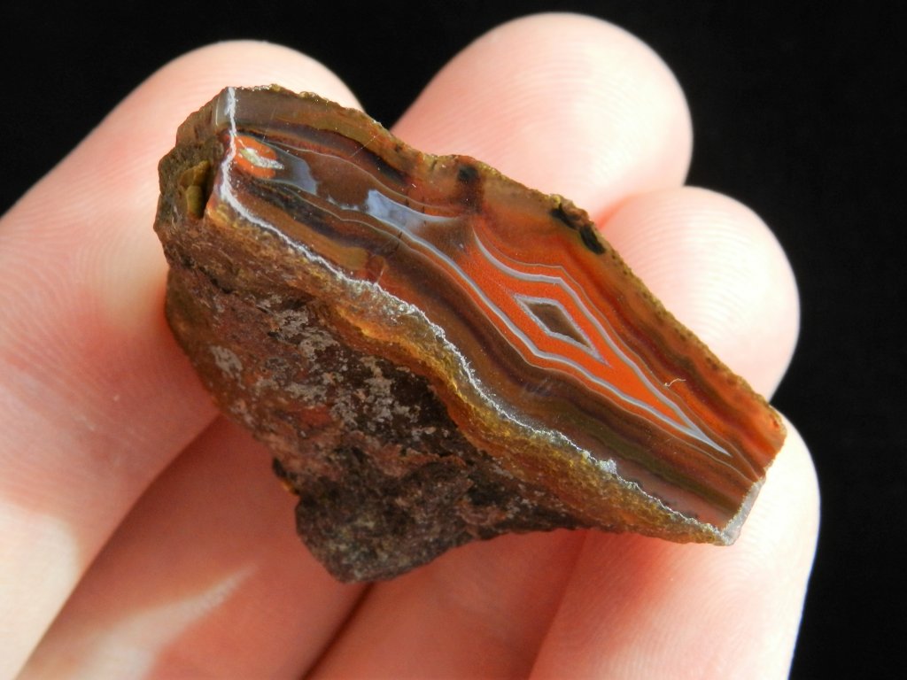 Jedná se o menší ukázku tzv. achátové pecky respektive její části. Celá achátová pecka totiž vypadá jako poměrně nevzhledná hrouda hlíny a její přírodní krása vynikne až pokud ji seříznete a důkladně vyleštíte.