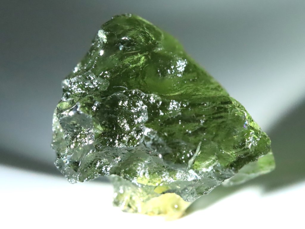 Tento vltavínek má na běžném denním světle / ve stínu poměrně tmavší zelený odstín s olivovými tóny.