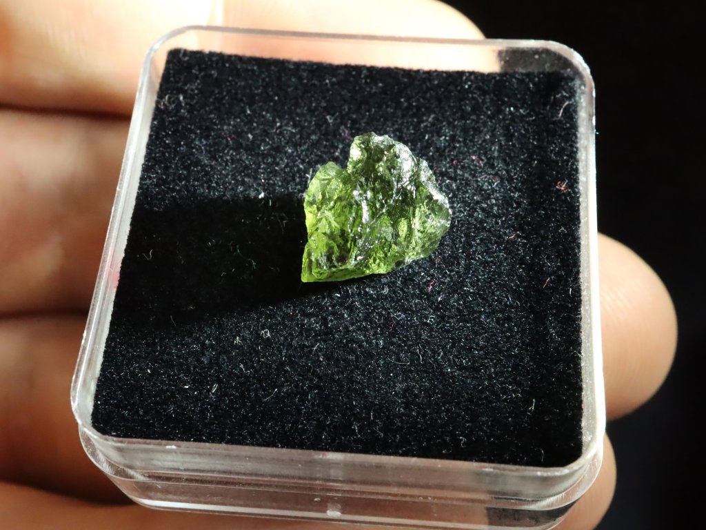 Vltavín obdržíte v kvalitní (hodnotné) uzaviratelné průhledné plastové krabičce s polstrovaným vnitřkem - viz. foto. Kamínek se vám tak nejen nikam nezatoulá, ale zároveň se jím budete moci přes průhledné plastové víčko krabičky i skvěle kochat.