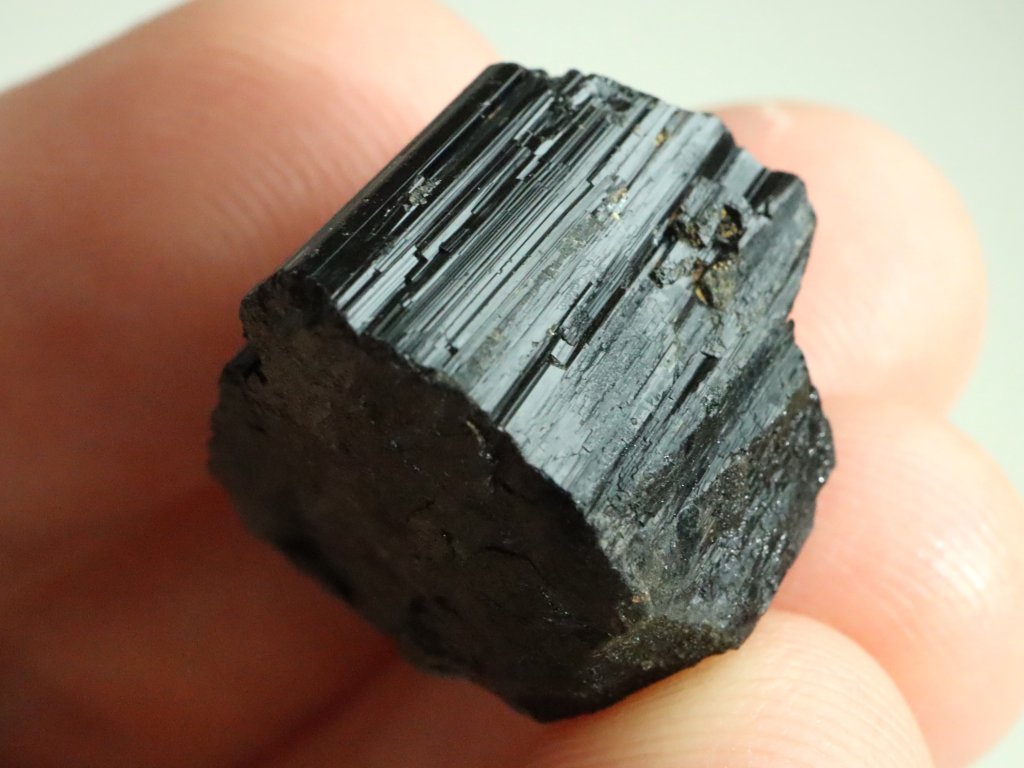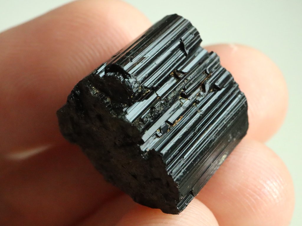 Turmalín je pevný, nedrobí se, má moc hezký lesk a pěkné jemné rýhování po obvodu.
