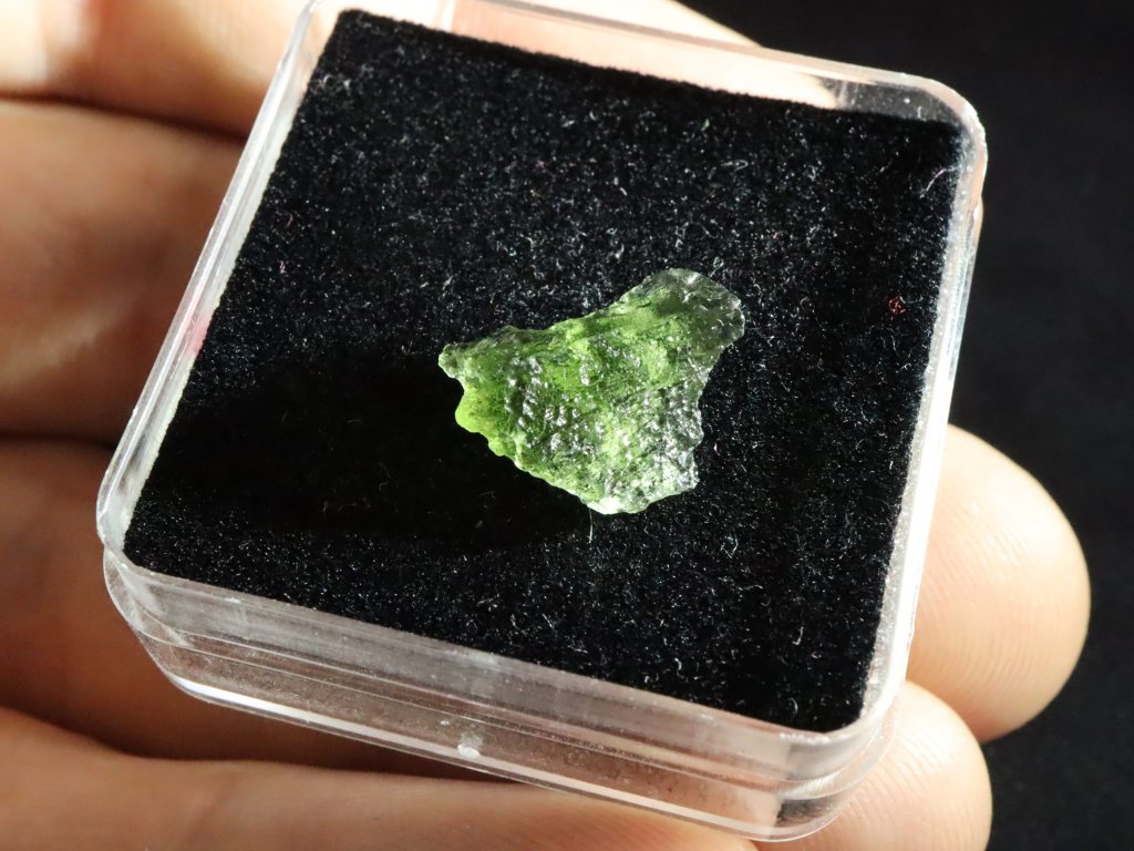 Vltavín obdržíte v kvalitní (hodnotné) uzaviratelné průhledné plastové krabičce s polstrovaným vnitřkem - viz. foto. Kamínek se vám tak nejen nikam nezatoulá, ale zároveň se jím budete moci přes průhledné plastové víčko krabičky i skvěle kochat.