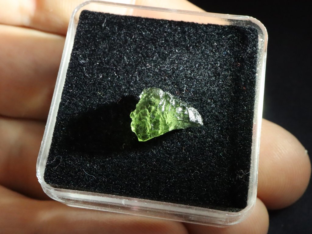 Vltavín obdržíte v kvalitní (hodnotné) uzaviratelné průhledné plastové krabičce s polstrovaným vnitřkem - viz. foto. Kamínek se vám tak nejen nikam nezatoulá, ale zároveň se jím budete moci přes průhledné plastové víčko krabičky i skvěle kochat.