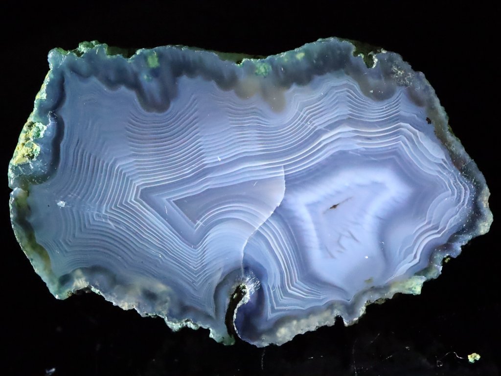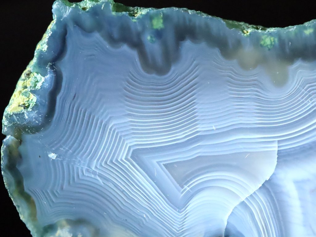 Leštěná polovina achátové pecky s pěkným modrým (obláčkovým) až modro-šedým odstínem a jemnou bílou kresbo .