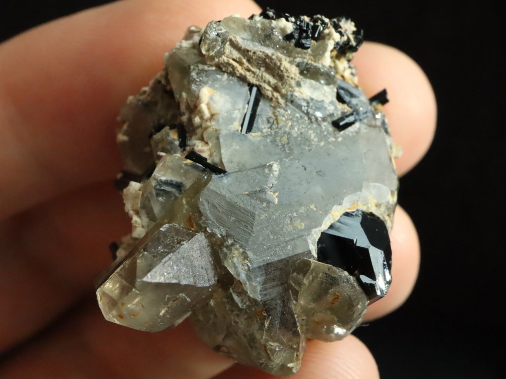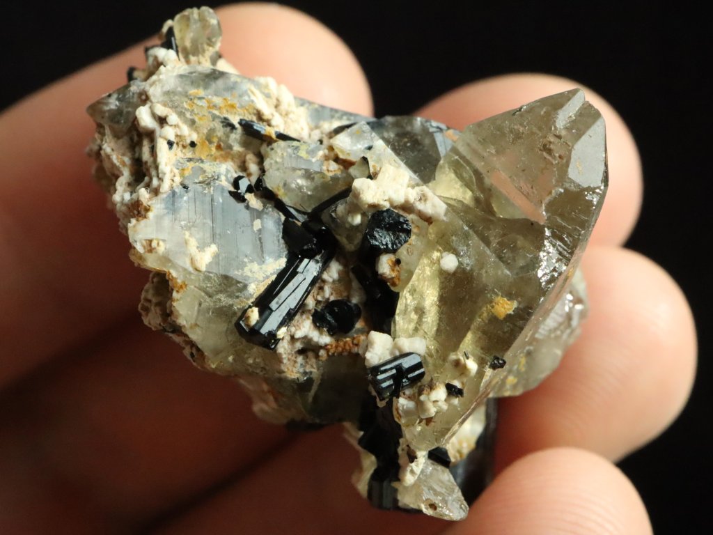 Dále zde najdete krystalky kouřových záhněd a také kousek mateční horniny v podobě bílého albitu.