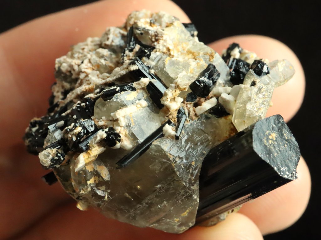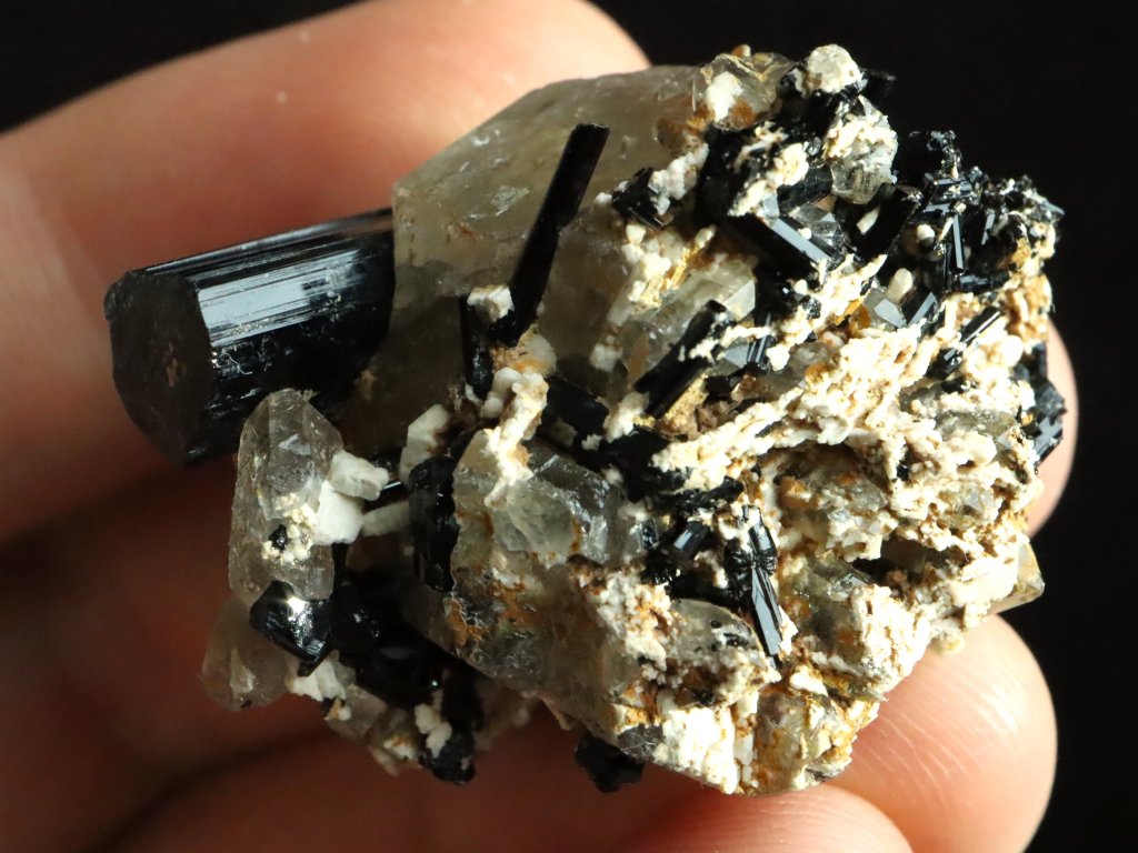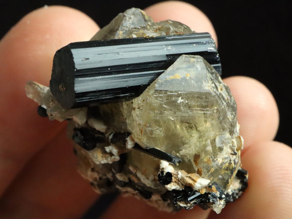 Mimořádně atraktivní kousek sdružující černý turmalín skoryl, záhnědu a albit pocházející z vyhlášené kamínkářské oblasti Pikárec na Vysočině.