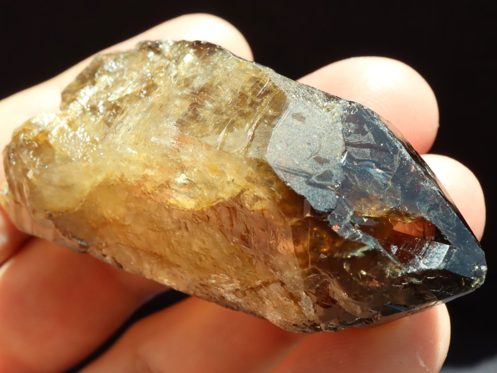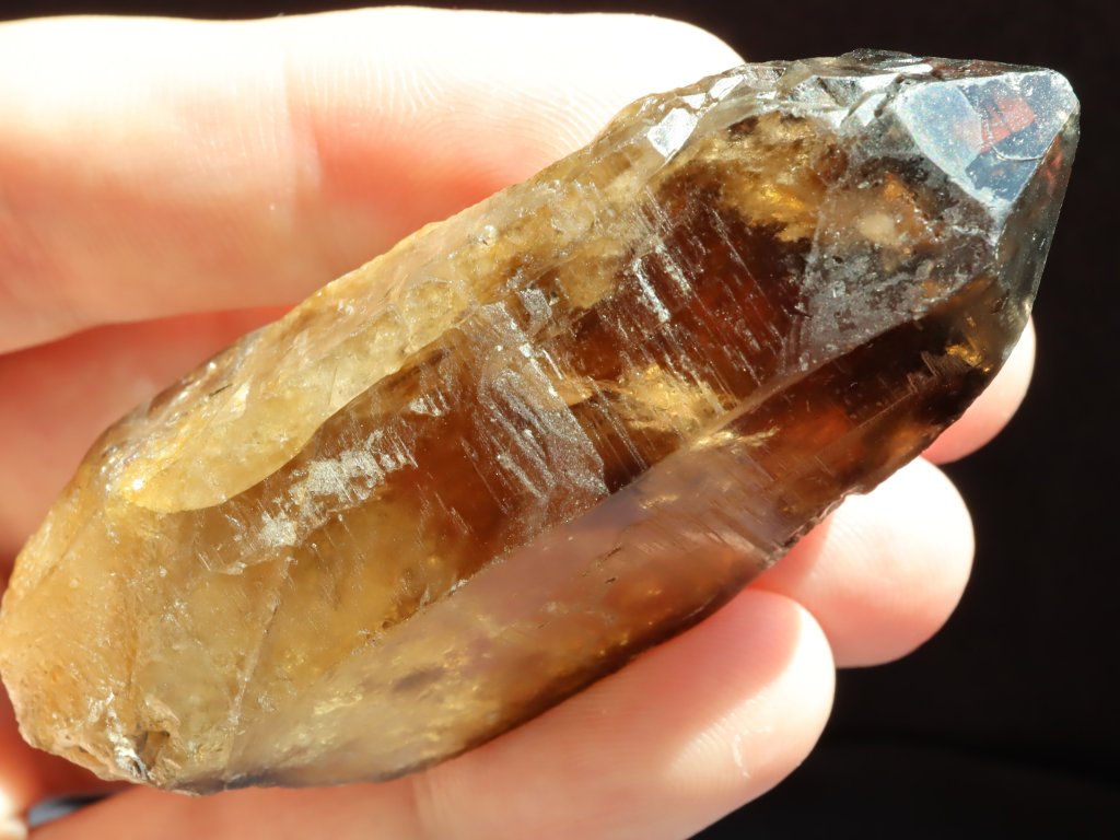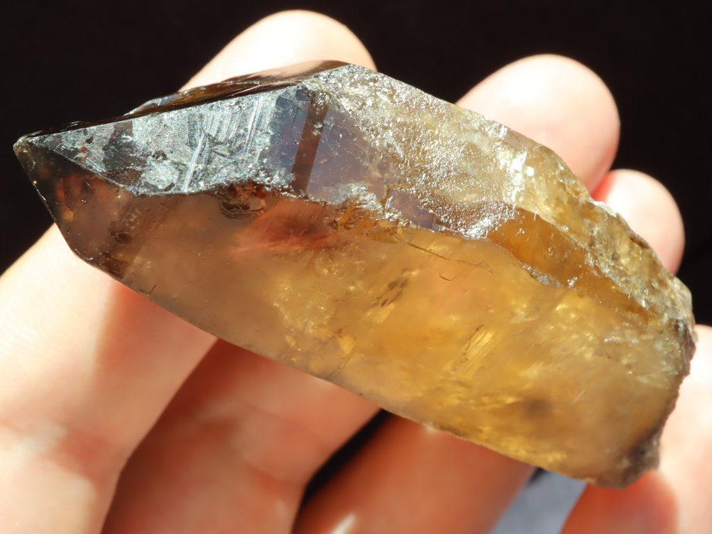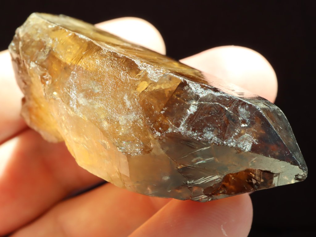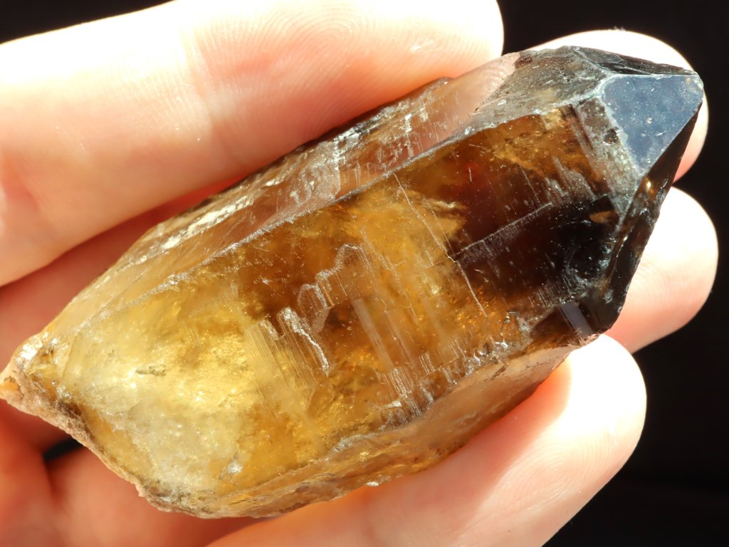 Na první pohled však jistě každého upoutá unikátní a velice vzácná barva tohoto citrínu. Krystal se totiž na sluníčku pyšní podmanivým a kvalitním středně až sytě žlutým odstínem se zlatavými až medovými tóny. Ve špici krystalu pak citrín pozoruhodně přechází do temného až černého zbarvení.