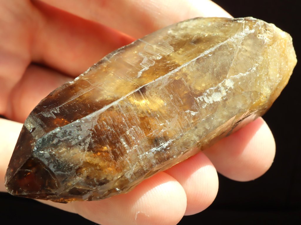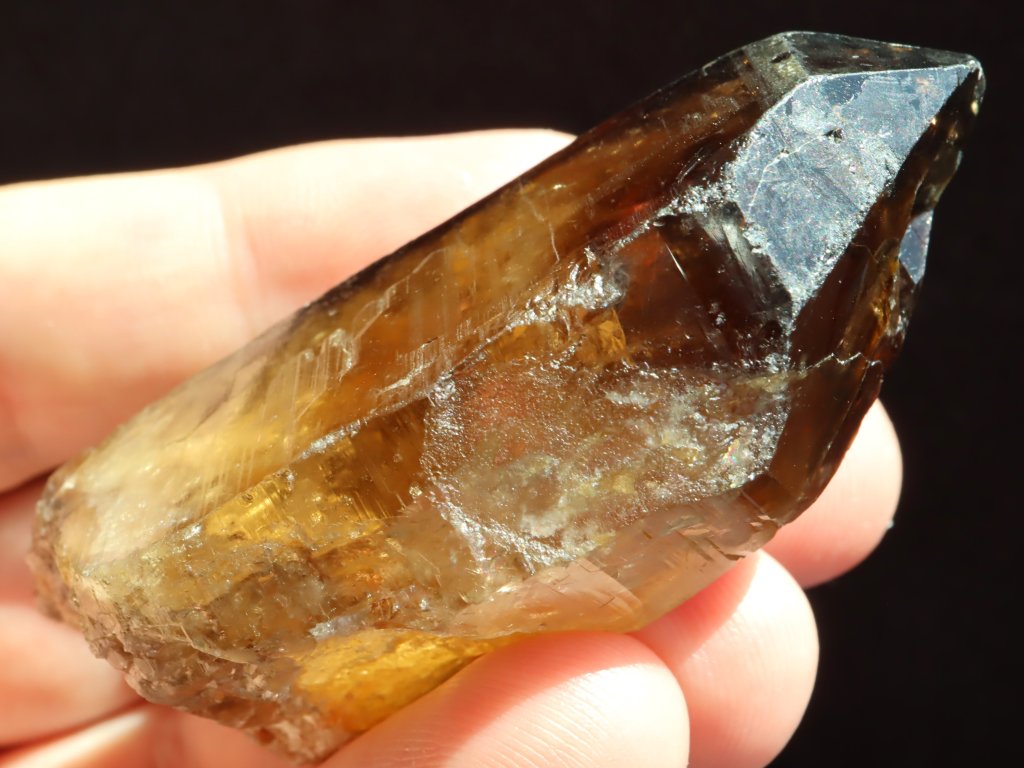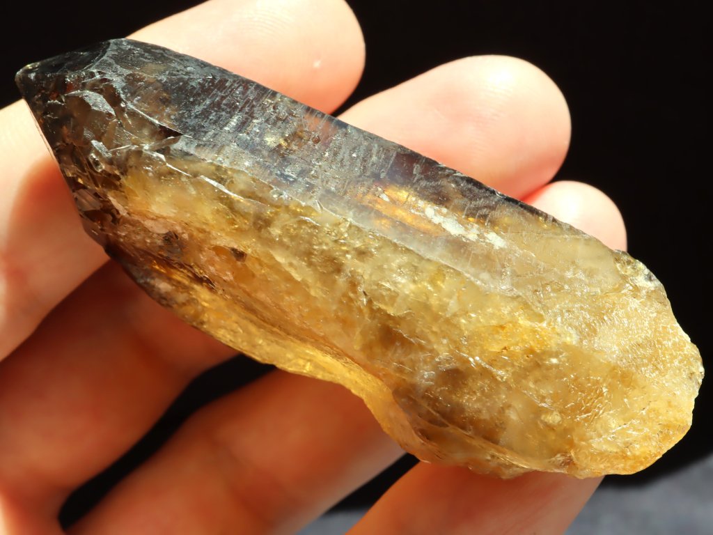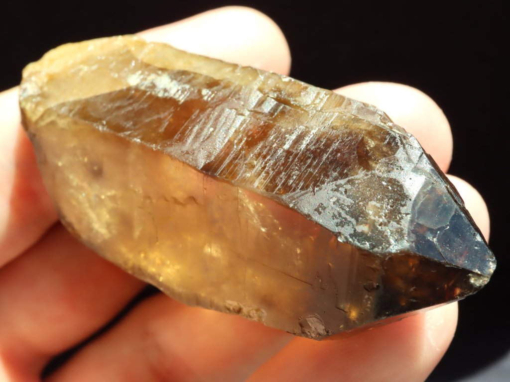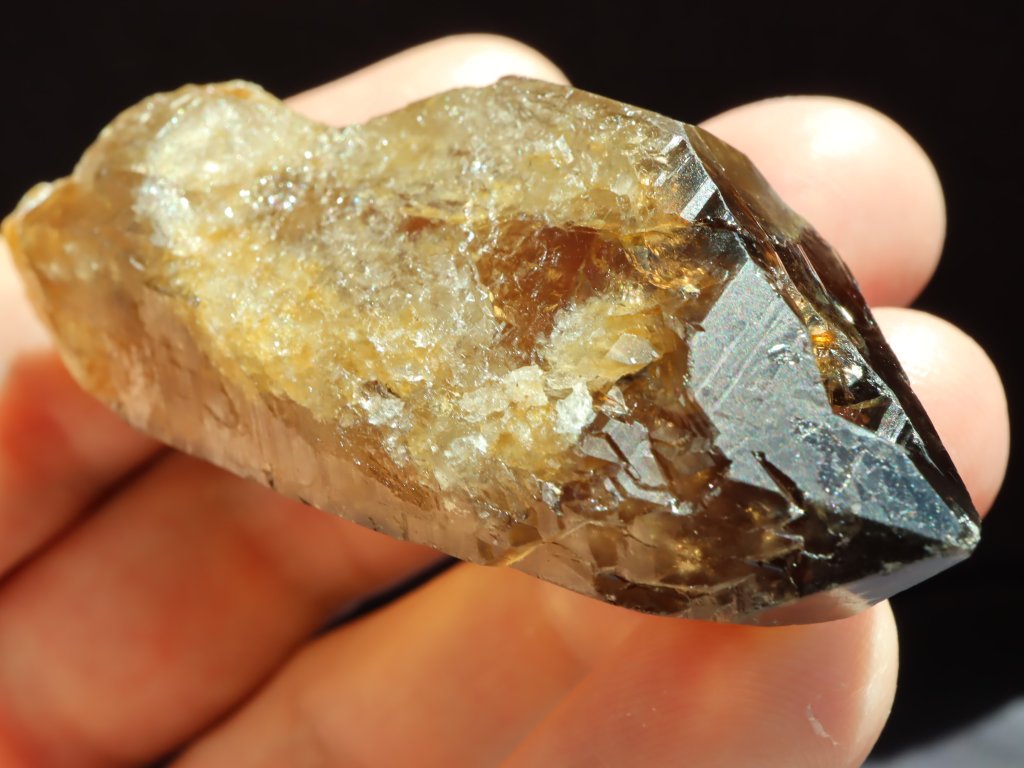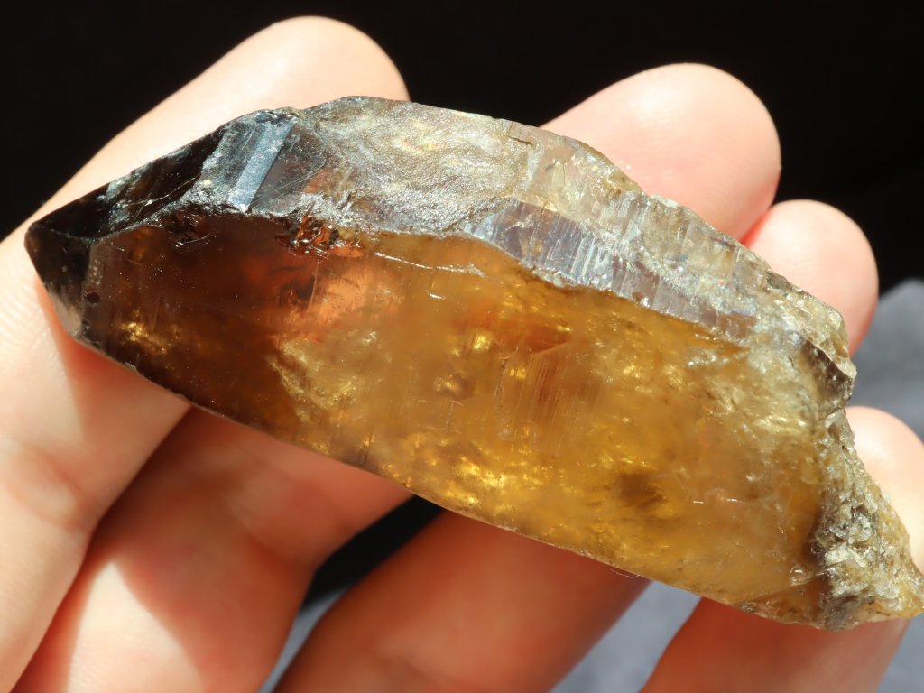 Na první pohled však jistě každého upoutá unikátní a velice vzácná barva tohoto citrínu. Krystal se totiž na sluníčku pyšní podmanivým a kvalitním středně až sytě žlutým odstínem se zlatavými až medovými tóny. Ve špici krystalu pak citrín pozoruhodně přechází do temného až černého zbarvení.