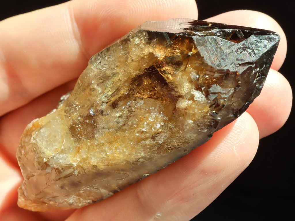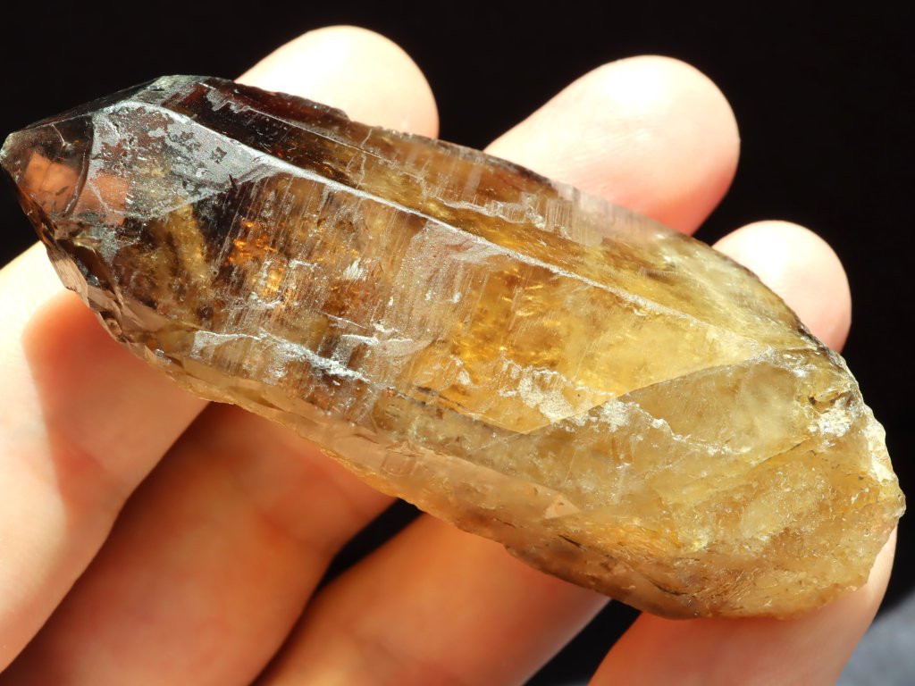 Sbírkový krystal citrínu s medovou až zlatavou barvou a černou špicí