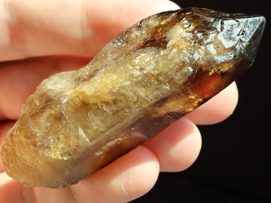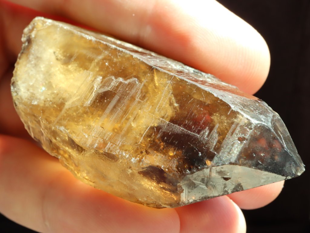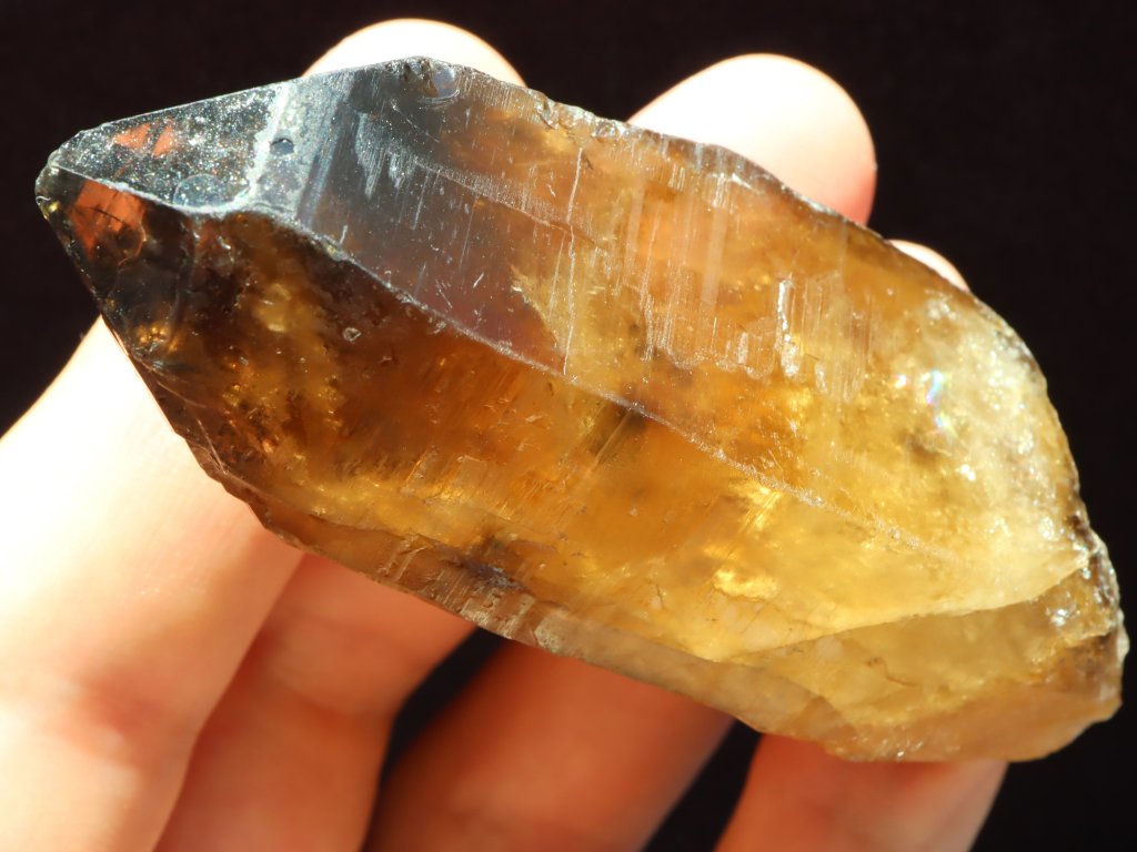 Povrch citrínu je částečně až zcela lesklý, pokud tedy krystal prosvítí sluneční paprsky či světlo baterky, můžete poměrně dobře nahlédnout prakticky do celého vnitřního světa kamene. Tam se ukrývá nejen vysoká až drahokamová čistota, ale obdivovat tu můžete i několik mlhovinových závojů či peříček, vyjímkou však nejsou ani drobné duhové odlesky (barevné duhy).