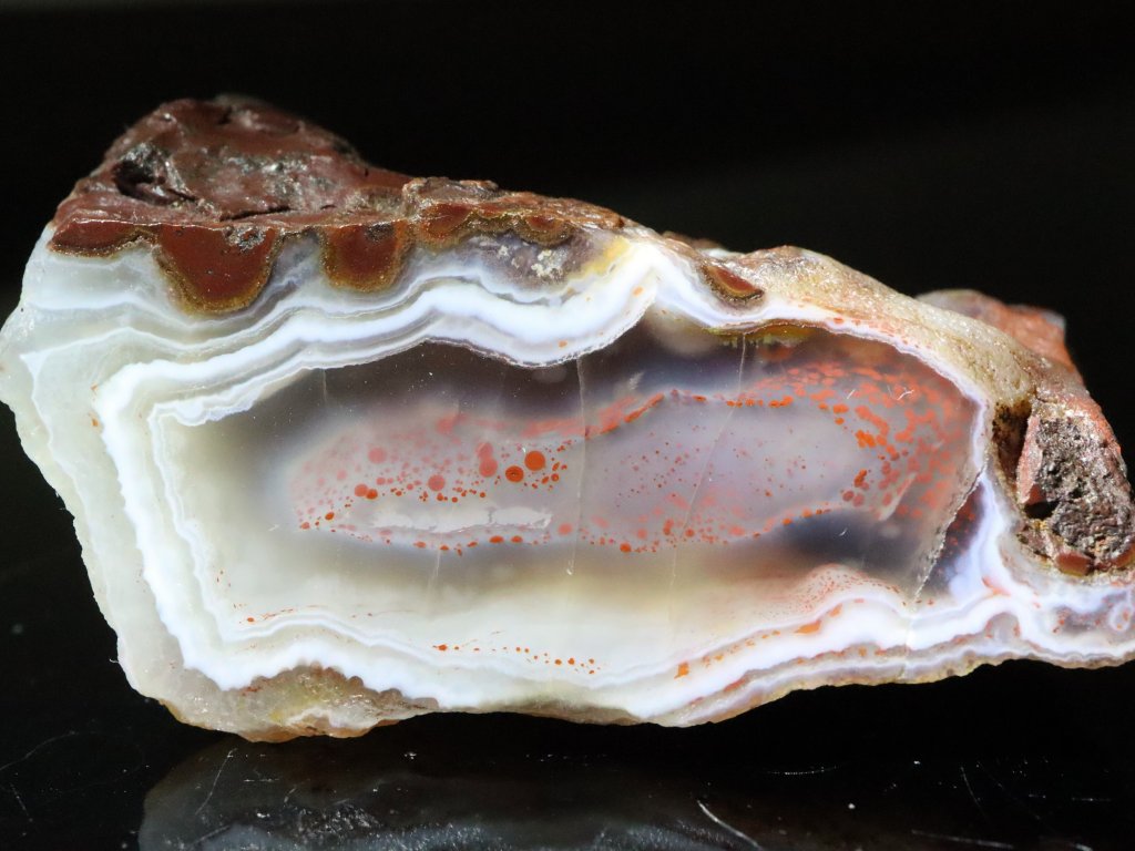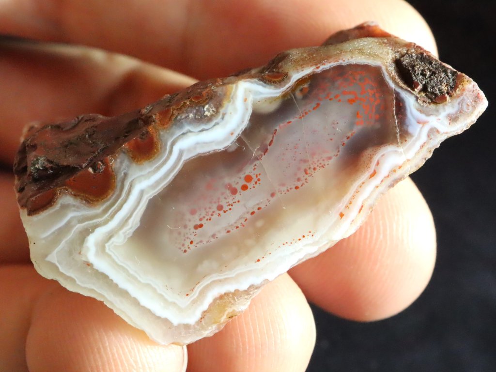 Tento achát zaujme výraznou bílou kresbou po obvodu a zajímavým částečně čirým středem s množstvím drobounkých oranžových teček.