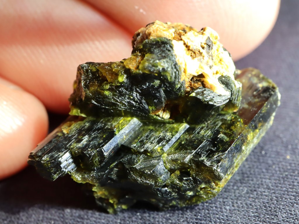 Silnější sloupcovitý krystal epidotu s temně zelenou barvou