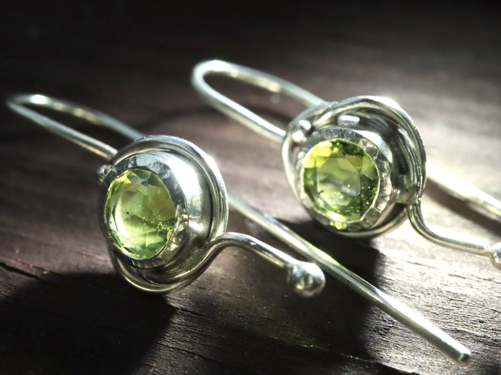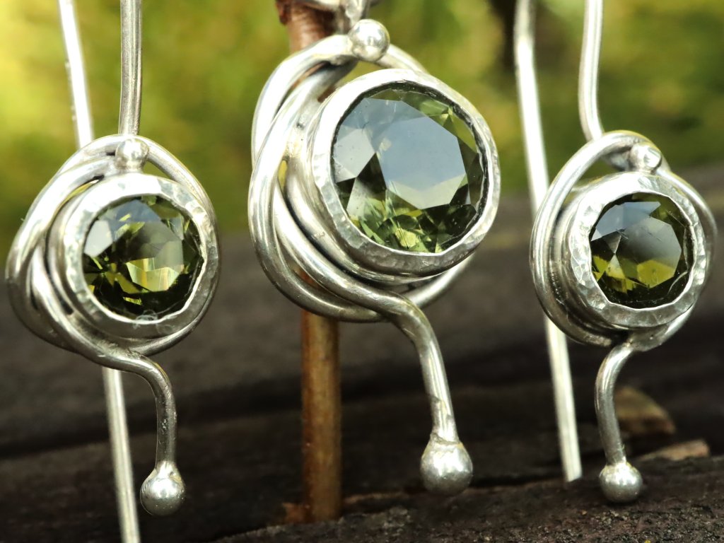 Kulaté broušené vltavínky jsou naším zlatníkem (faserem) precizně usazeny do lůžka, kde je bezpečně drží stříbrný kroužek s patinou označovanou jako "starostříbro". Tento kroužek je ještě vkusně opletený stříbrným drátkem s několka kapkami / kuličkami stříbra, což dotváří celkový estetický vzhled přívěsku i naušnic.