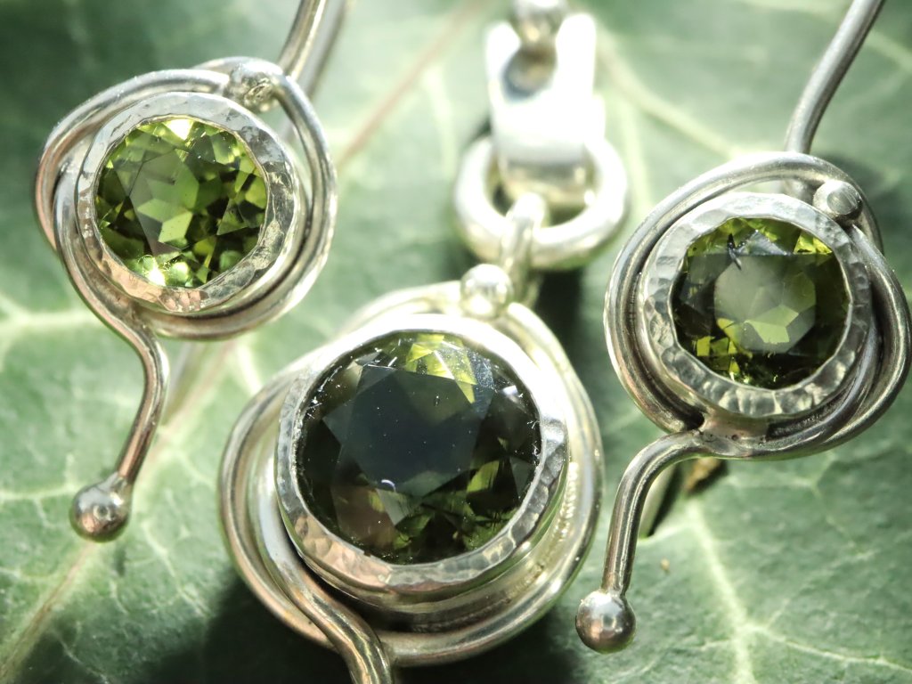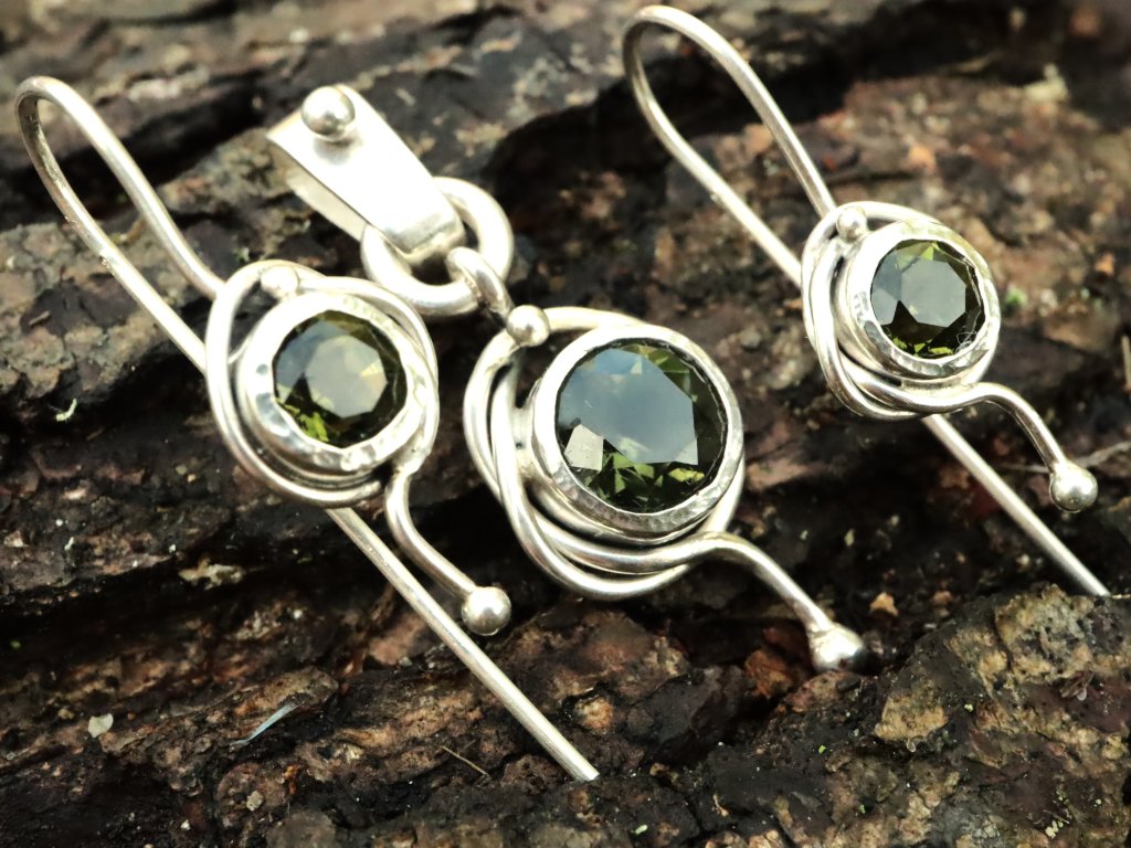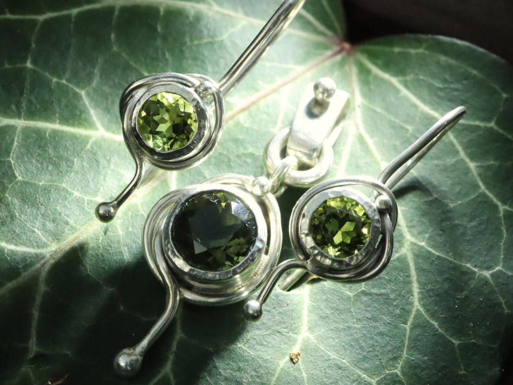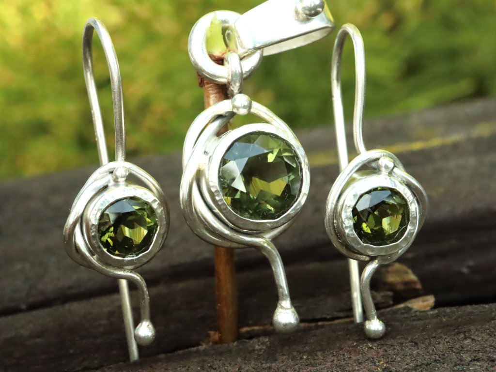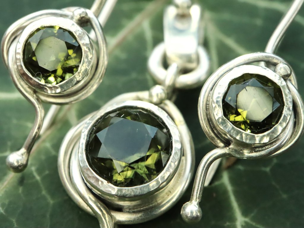 Šperkový set s broušenými vltavíny - Přívěsek s naušnicemi ve stříbře