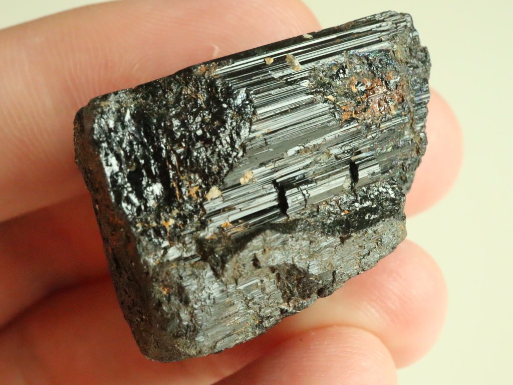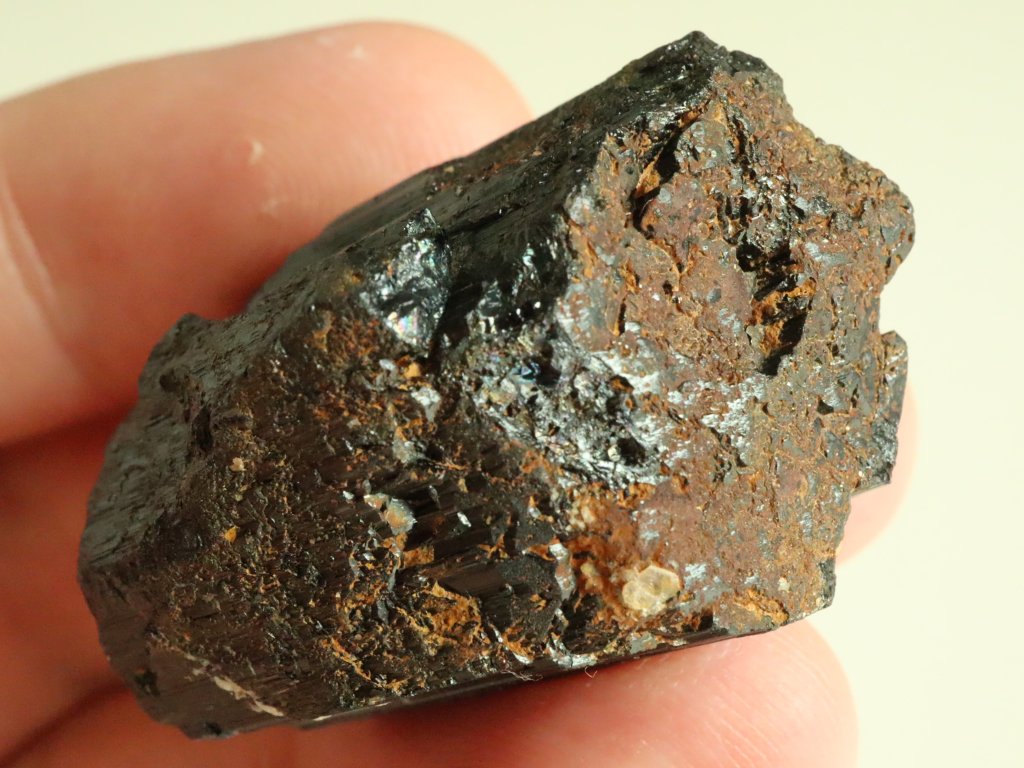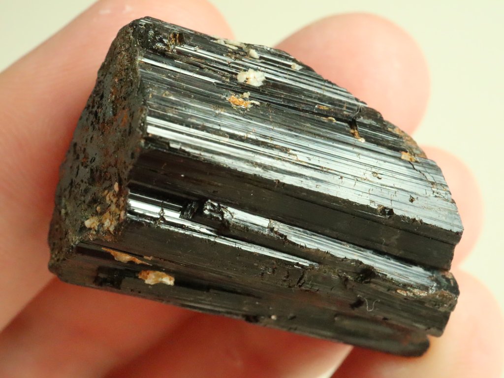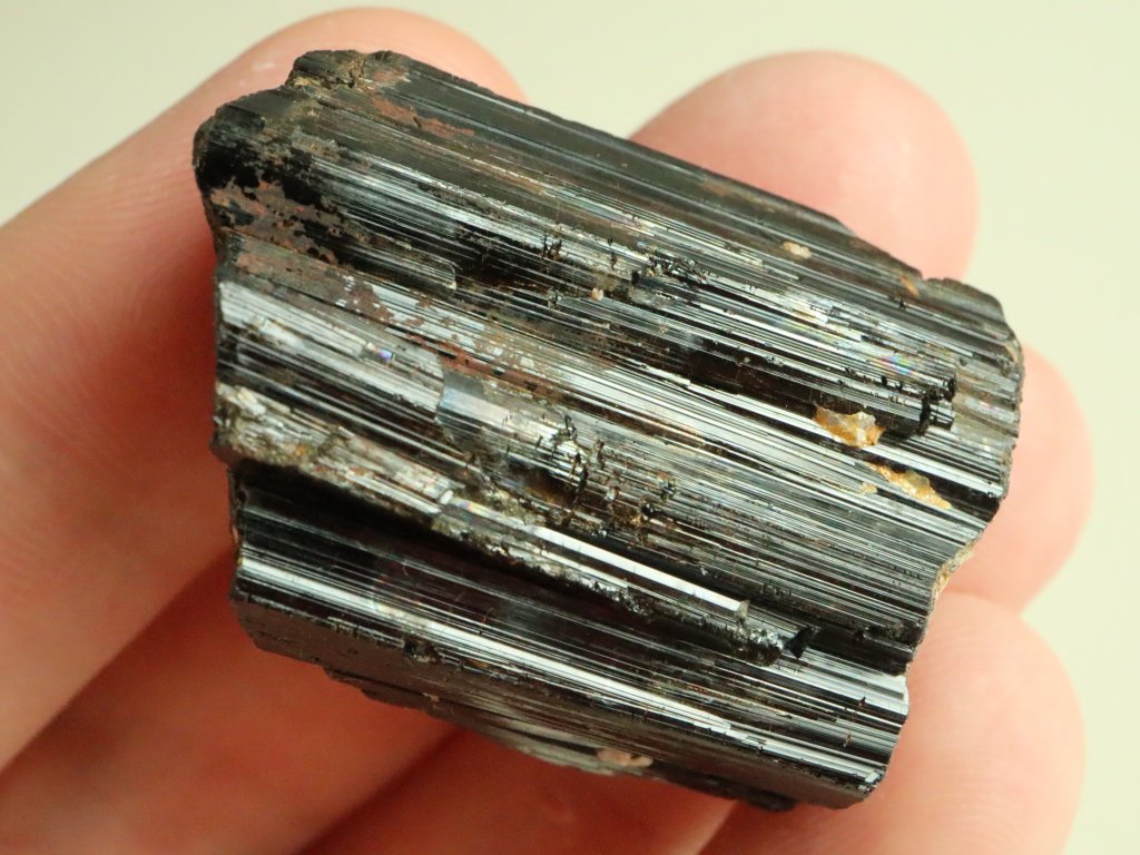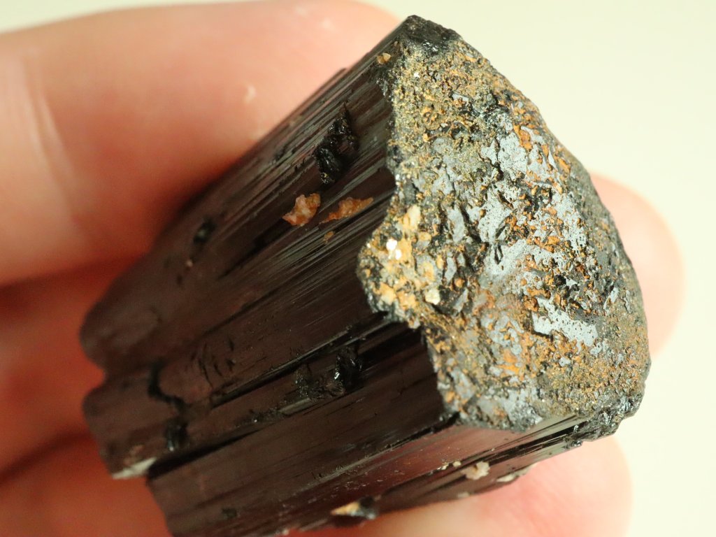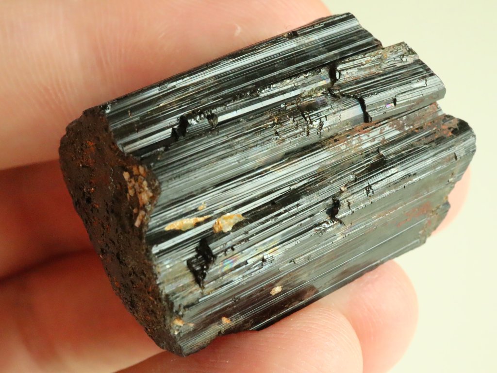 Tento turmalín má skvělý poměr mezi velikostí a cenou, z jedné strany zaujme pěkným leskem a rýhováním, druhá strana je pak částečně pokrytá povlakem / krustou hnědo-oranžového limonitu, díky kterému má turmalín hezkou "přírodní patinu".