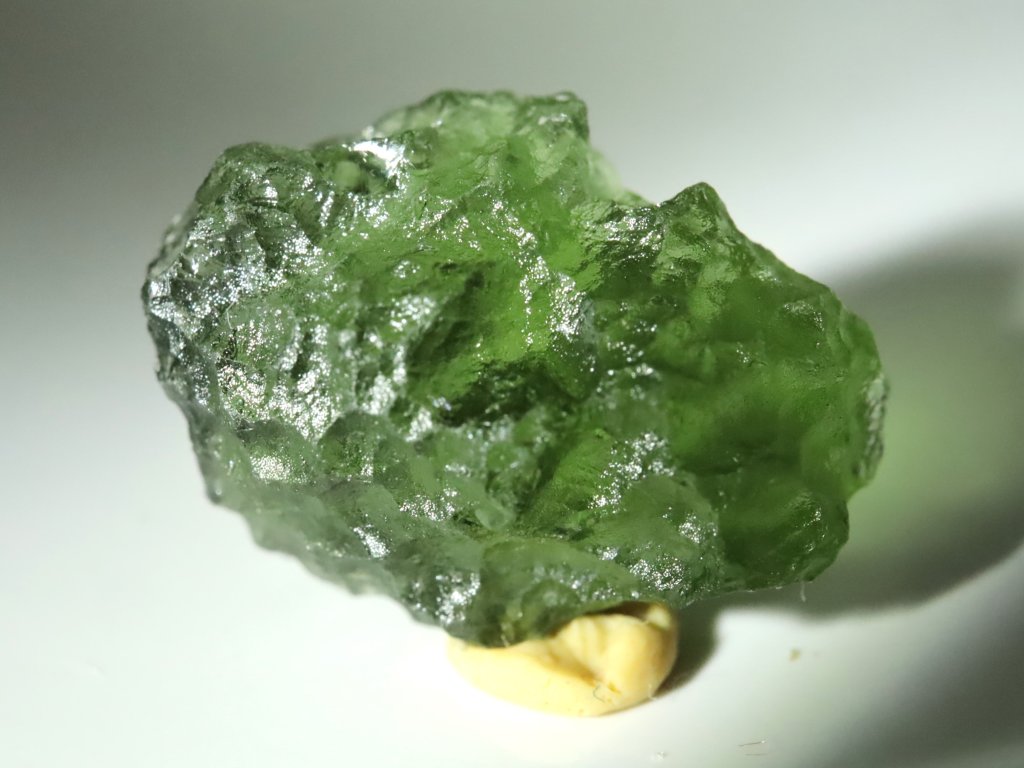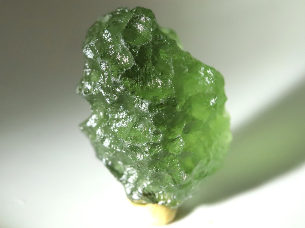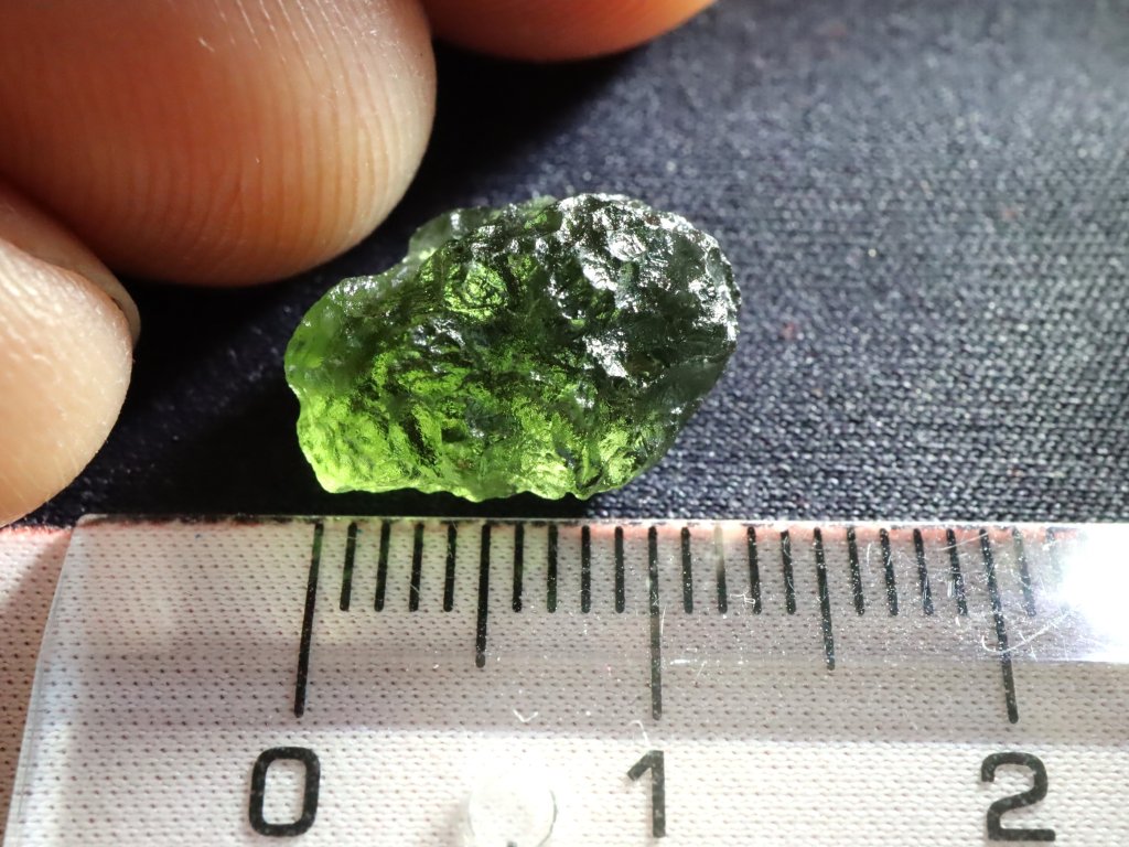 Přírodní vltavín (moldavit) s váhou 1,03 gramu, nalezený v oblasti jižních Čech.