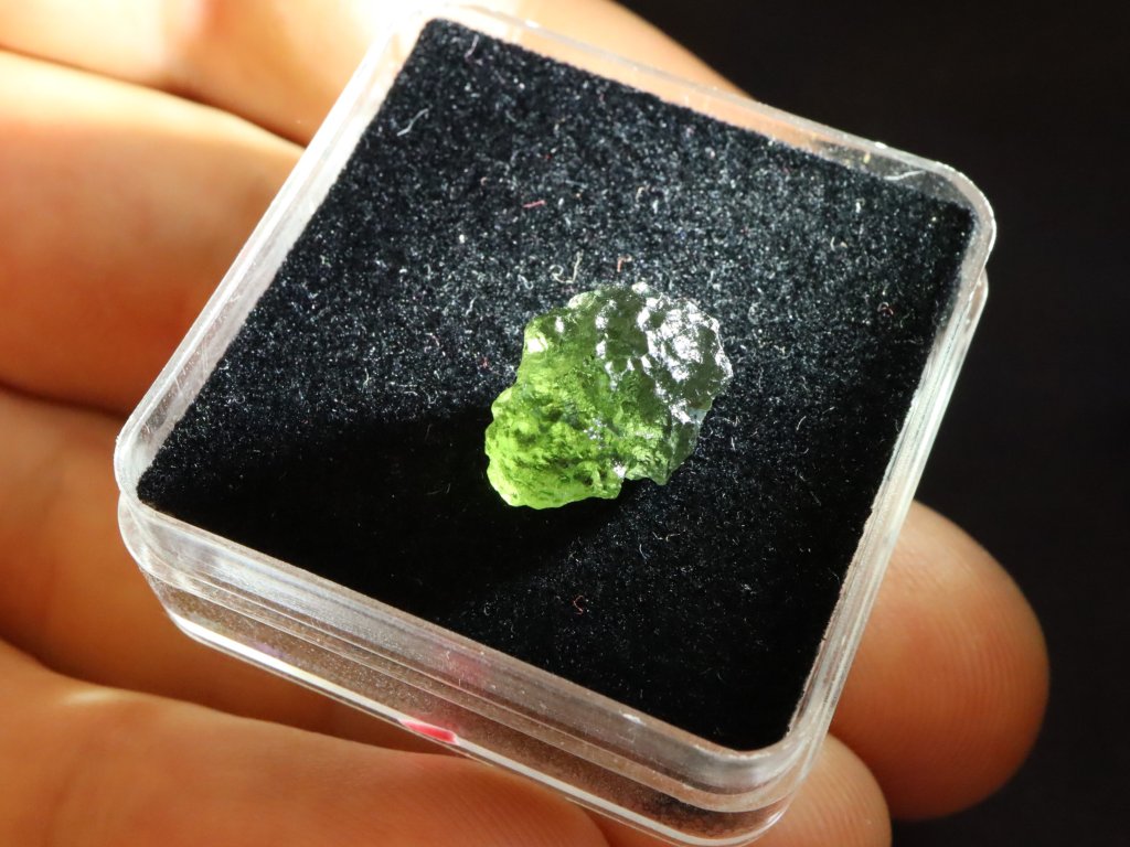 Vltavín obdržíte v kvalitní (hodnotné) uzaviratelné průhledné plastové krabičce s polstrovaným vnitřkem - viz. foto. Kamínek se vám tak nejen nikam nezatoulá, ale zároveň se jím budete moci přes průhledné plastové víčko krabičky i skvěle kochat.