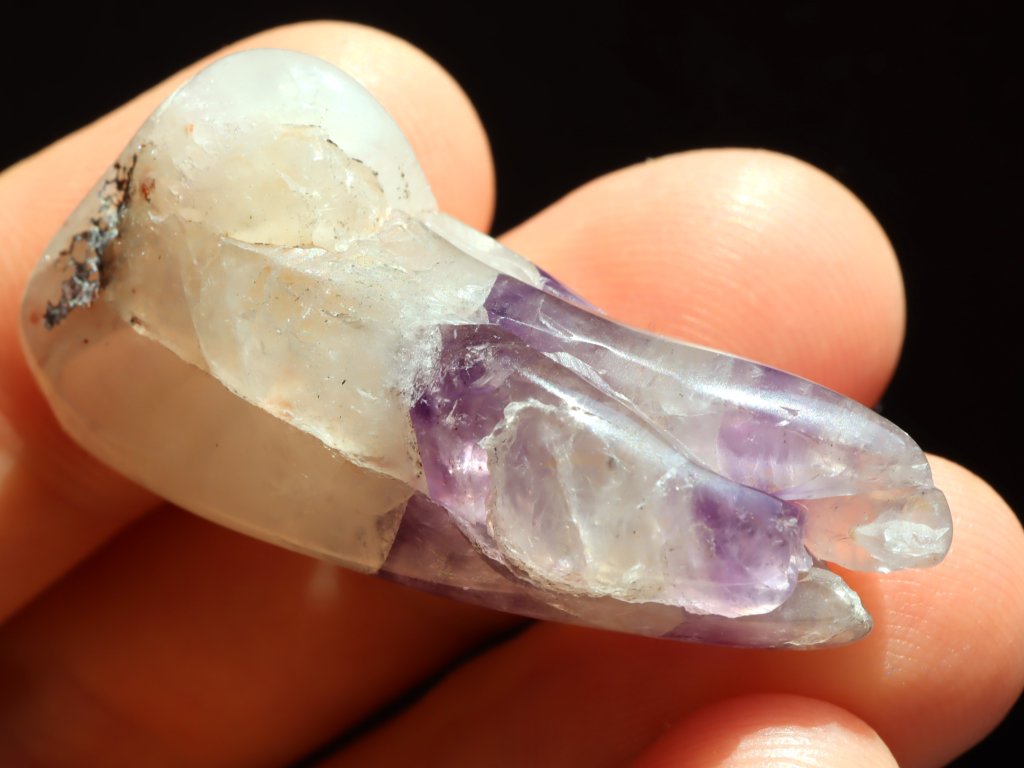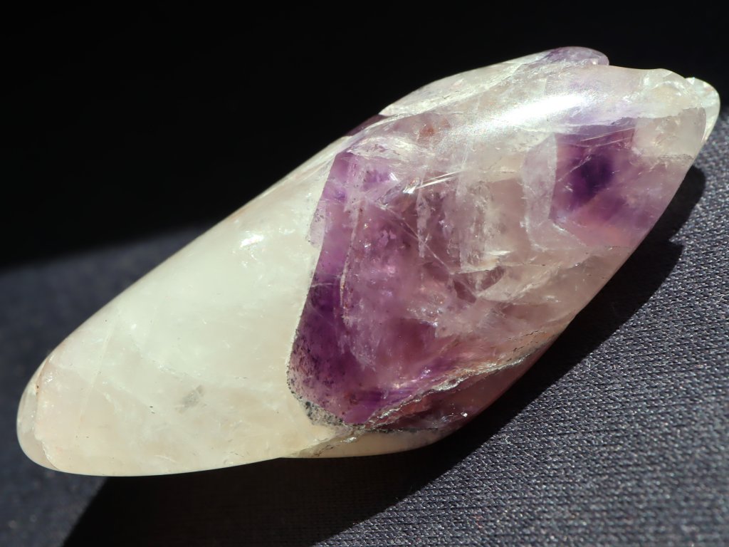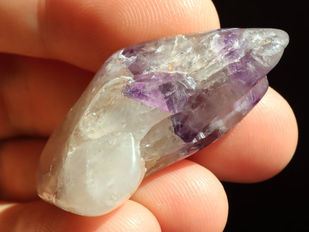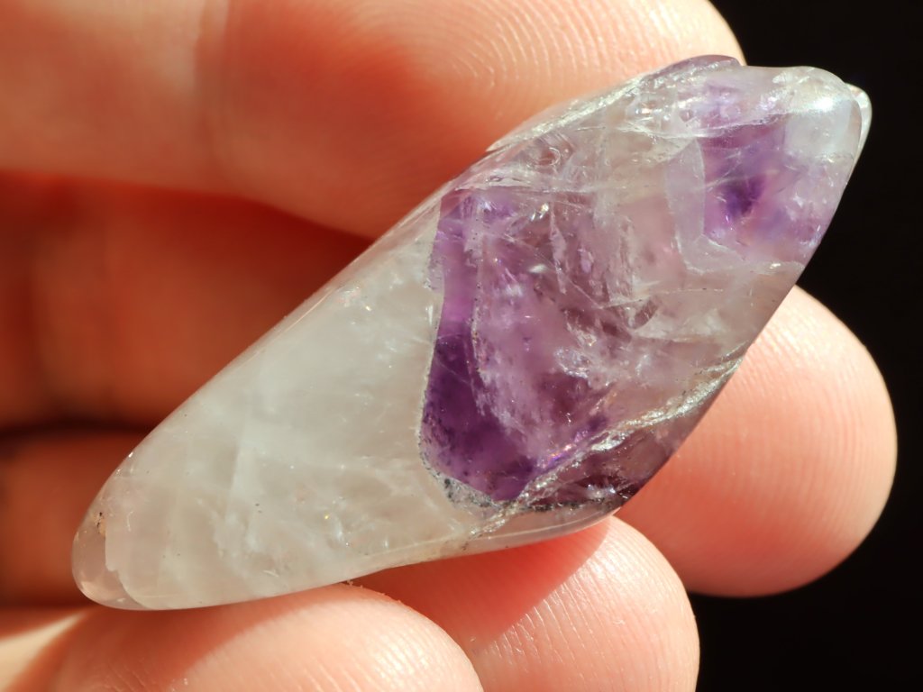 Jde o tromlovaný valounek ametystu ve spojení s mléčným křemenem a lehce i čirým ledovým křišťálem.