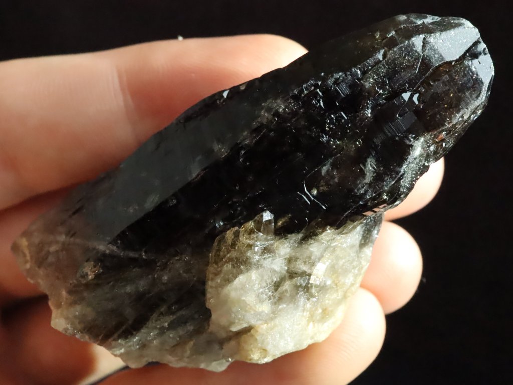 Temně černý lesklý krystal morionu na křemenné podložce - Délka 7 cm