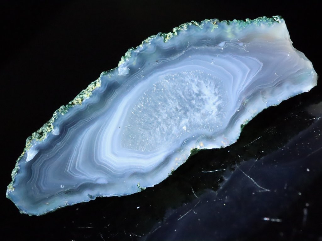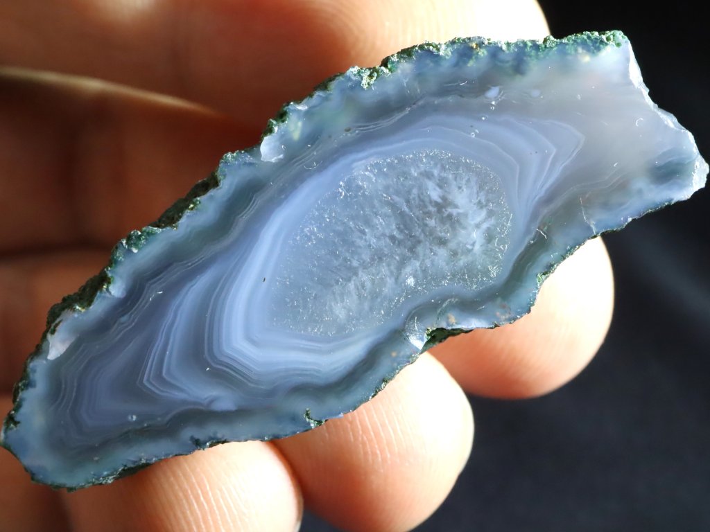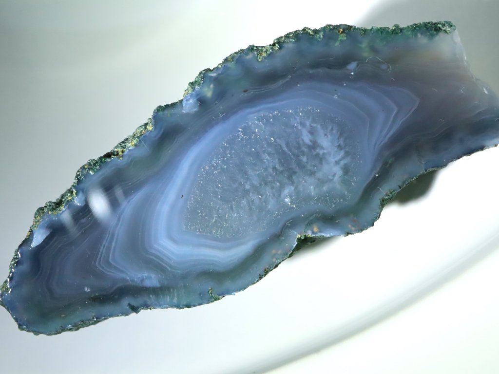 Leštěná polovina achátové pecky s pěkným tmavším modrým (obláčkovým) až modro-šedým odstínem, decentní kresbou a drobnou křišťálovou výplní uprostřed.
