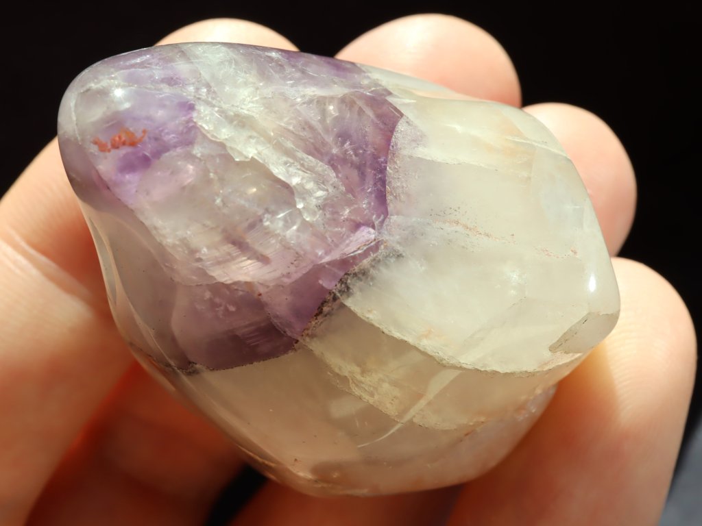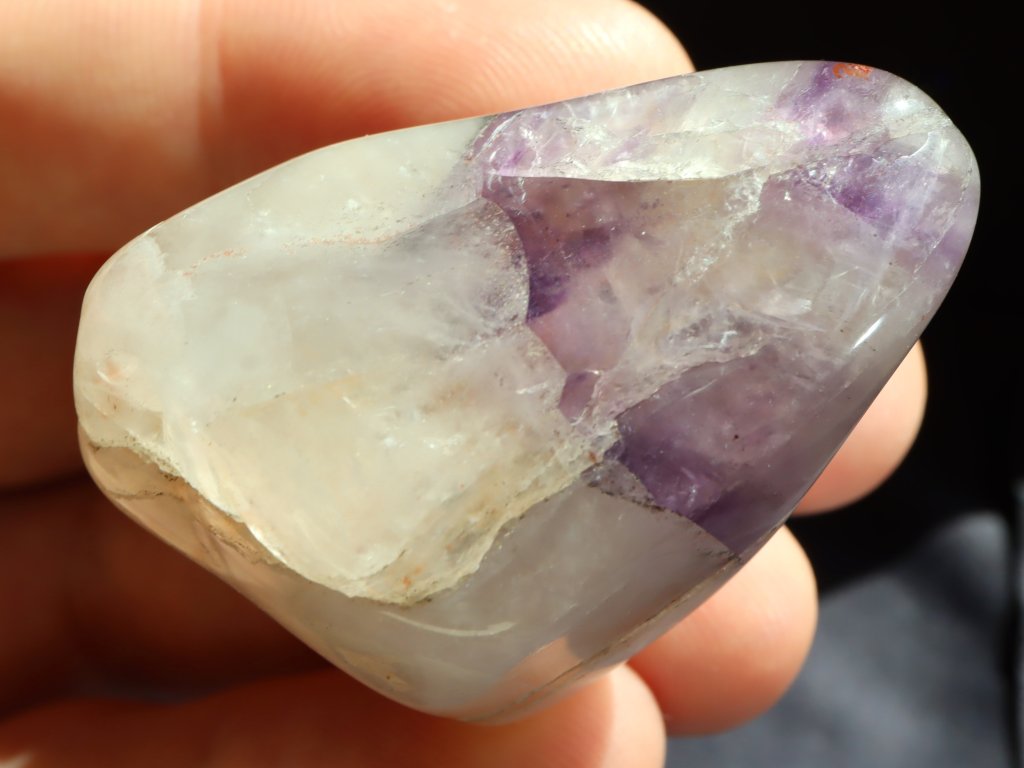 Jde o tromlovaný valoun ametystu ve spojení s mléčným až šedým křemenem a nepatrně i čirým ledovým křišťálem.