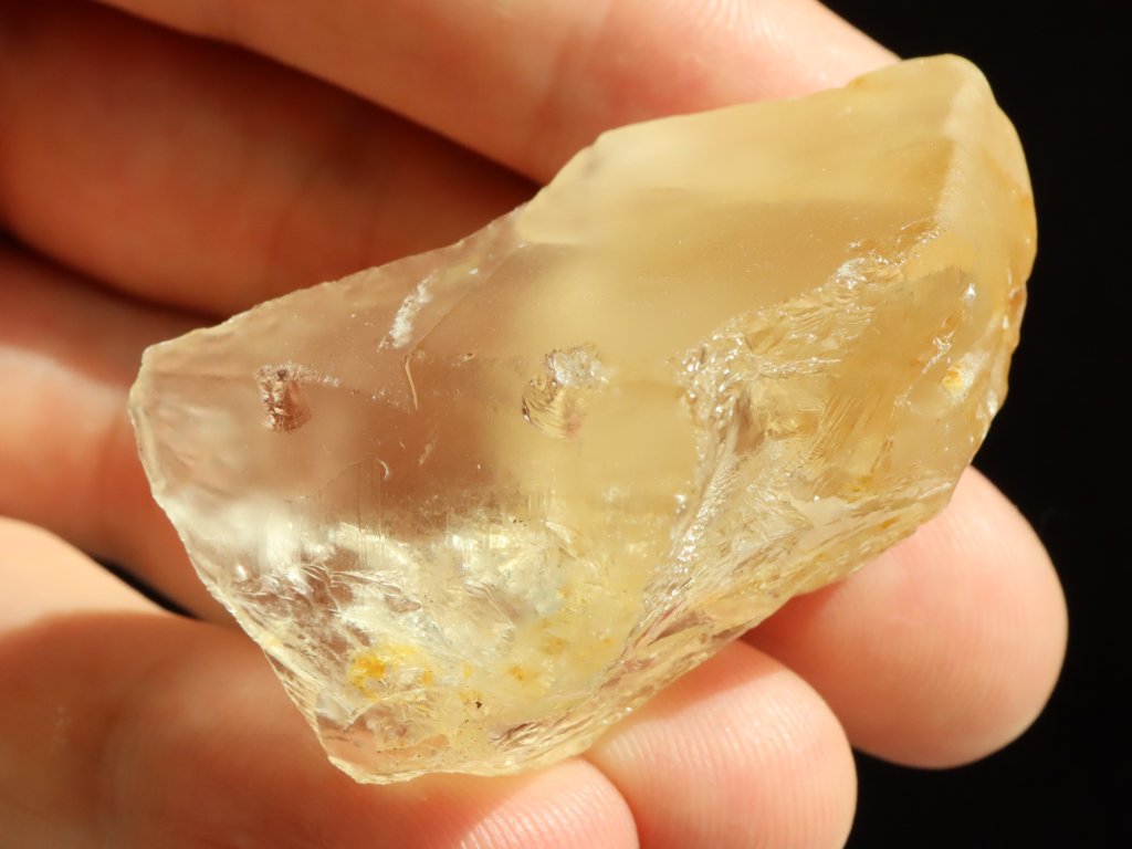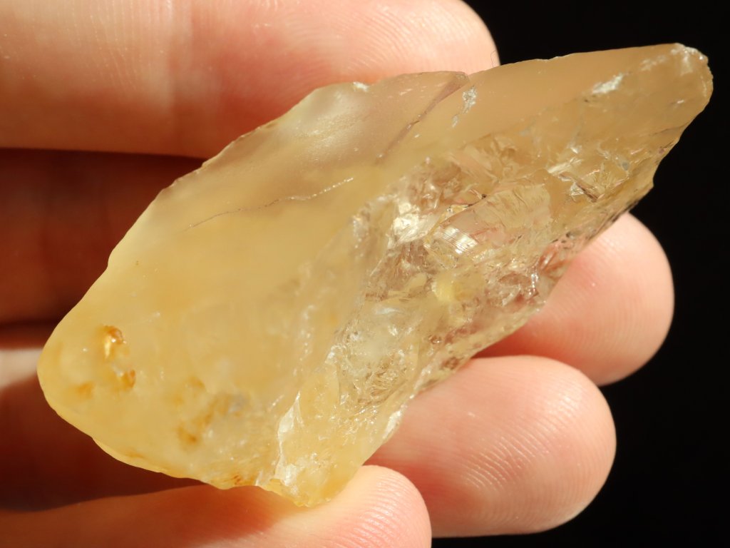 Jde o zlomek / úlomek krystalu citrínu, který na sluníčku zaujme vyjímečně kvalitní středně žlutou barvou s jemnými zlatavými tóny. (Na posledních dvou snímcích je kamínek mokrý).