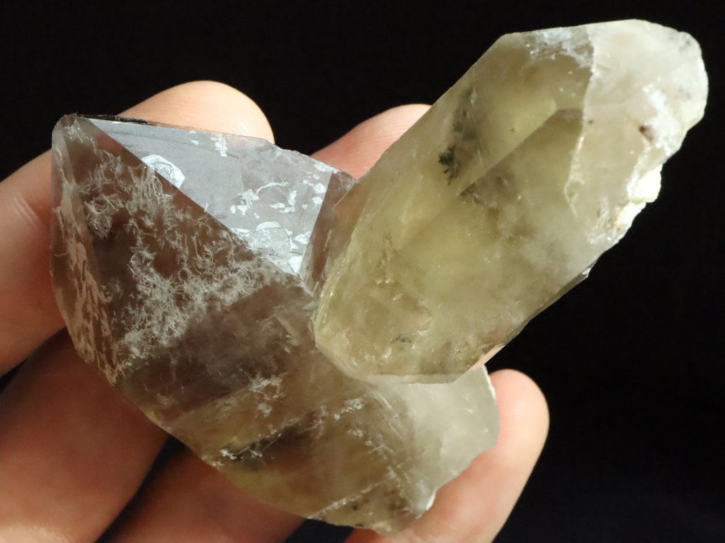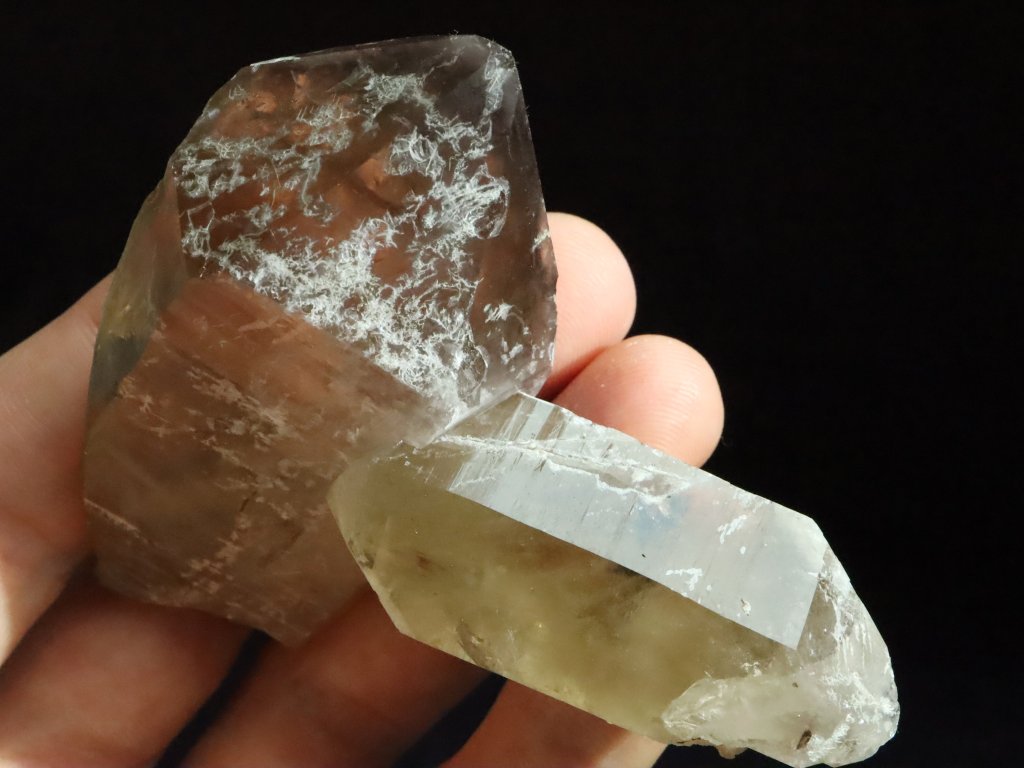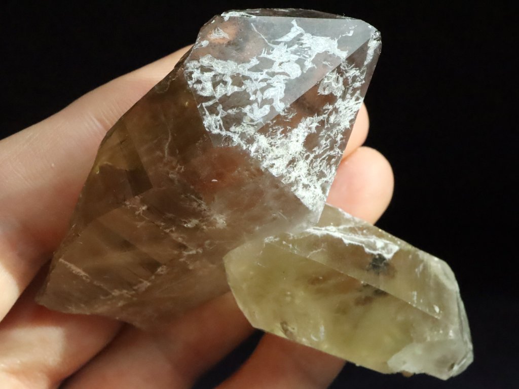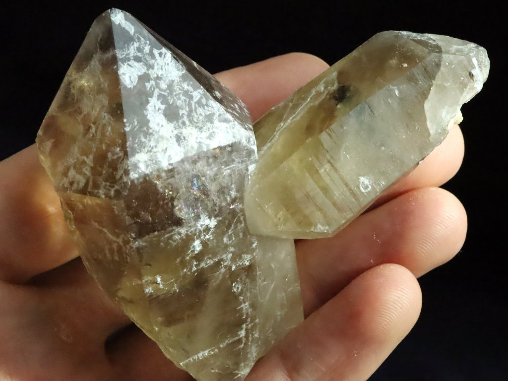 Oba krystaly mají z přední pohledové strany krásně zachovalé obvodové stěny i samotné špice, ze zadní strany se pak plochy nenachází - Menší z krystalů je zde tzv. otlačený od okolnní mateční horniny, ten větší pak spíše odštípnutý, takto už byl však vzorek v přírodě nalezen.