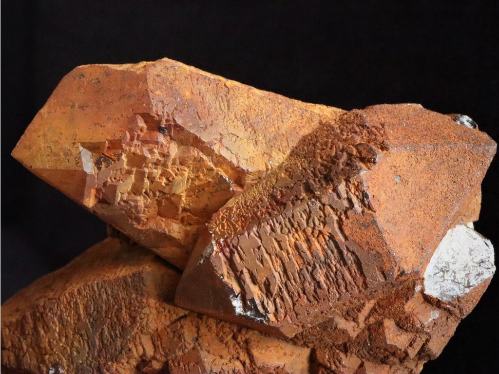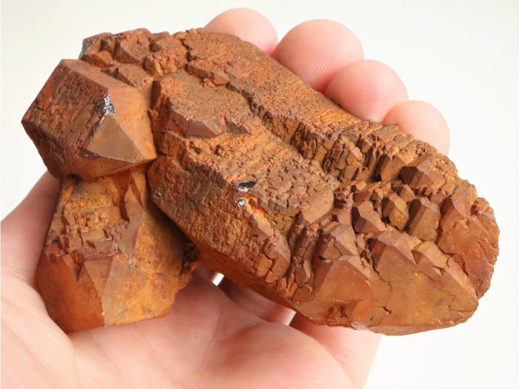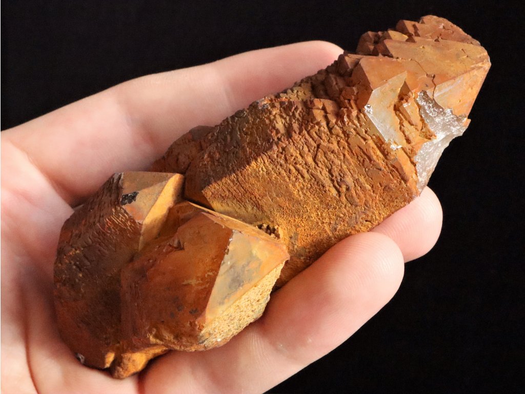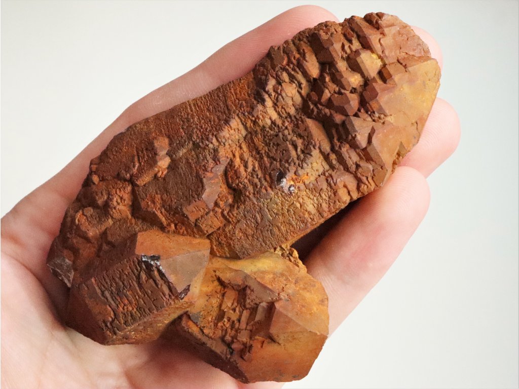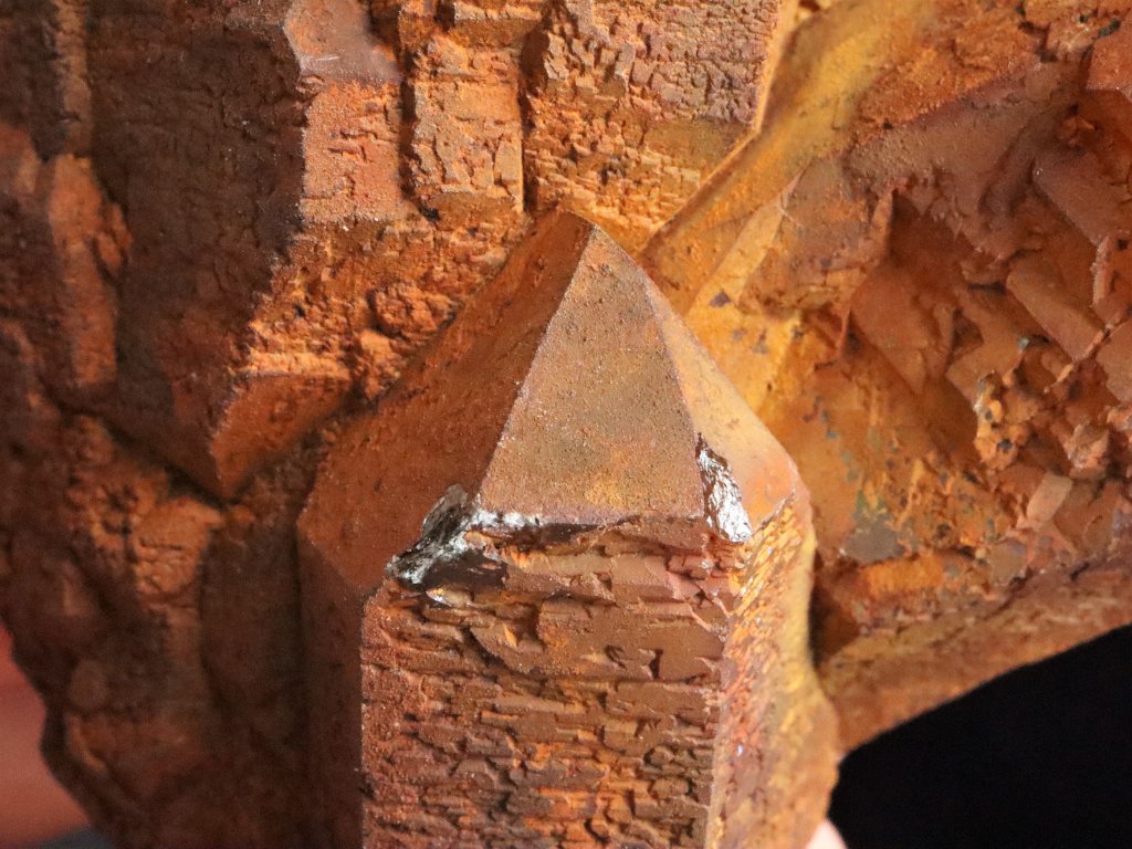 V našem případě je však prakticky celý povrch křemene pokrytý povlakem, vrstvičkou či chcete-li krustou přírodního hnědo-oranžového limonitu neboli oxidu železa. Ten propůjčuje kameni naprosto jedinečný vzhled a vzorek působí dojmem jako by byl "ožehnutý ohněm". Navíc tento limonit dodává kameni vyjímečnou trojrozměrnost (prostorovost) takže krystaly i jejich elestiální růst zde fantasticky vyniknou.