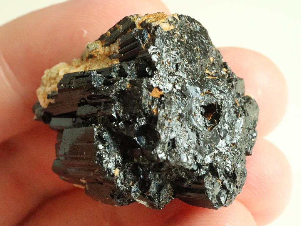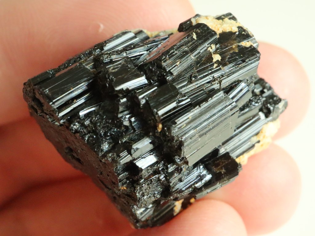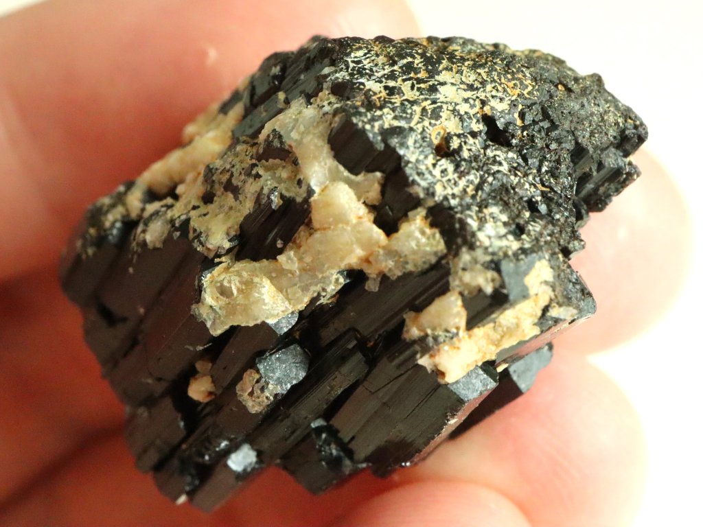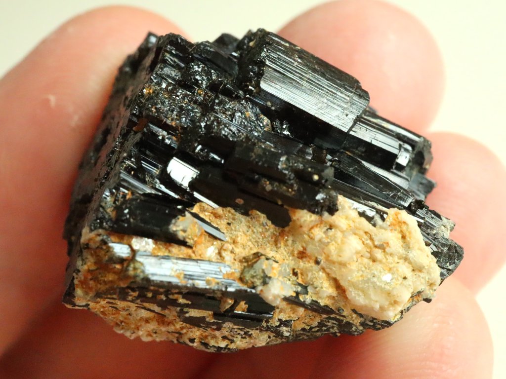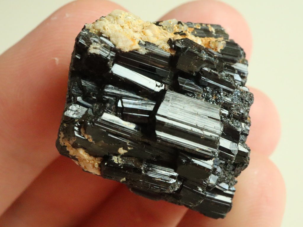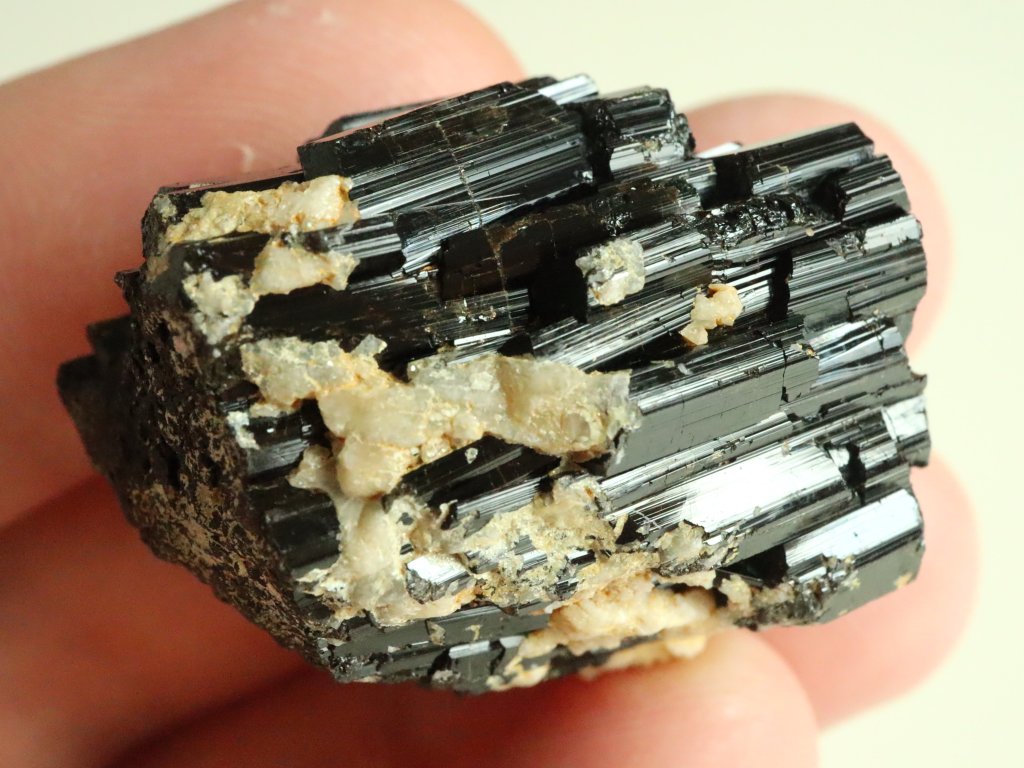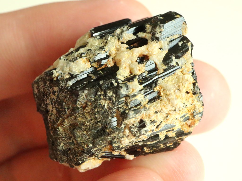 Pohledný kousek přírodního černého turmalínu skorylu nalezený na významném mineralogickém nalezišti Pikárec (Vysočina).