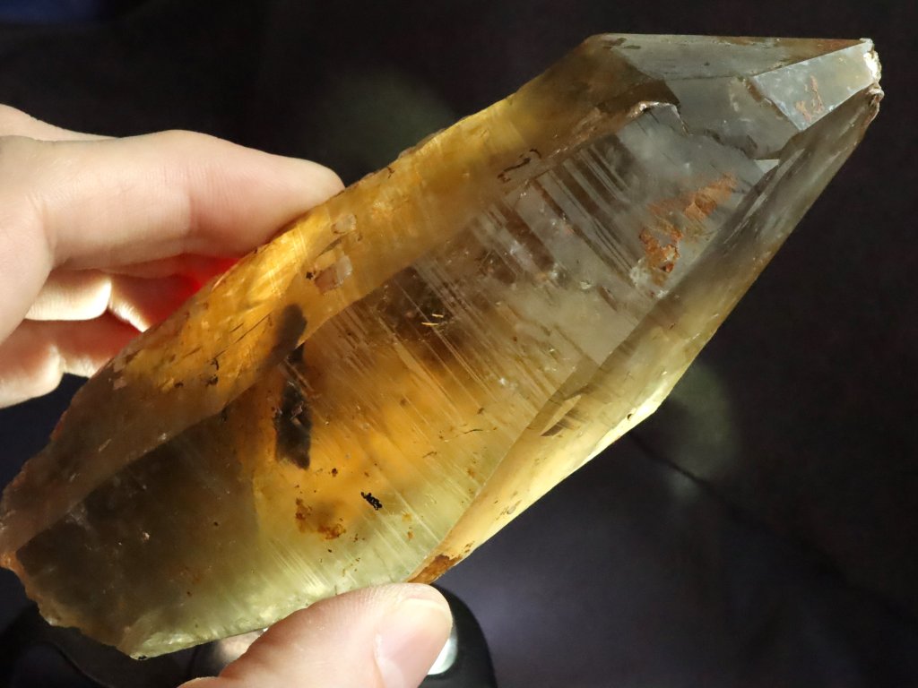 Při prosvícení krystalu lze také omezeně /částečně nahlédnout do vnitřního světa, kde se ukrývá nejenom solidní čistota, ale také mlhoviny či větší peříčka. Pouze špice morionu je lehce zakalená mléčným křemenem.