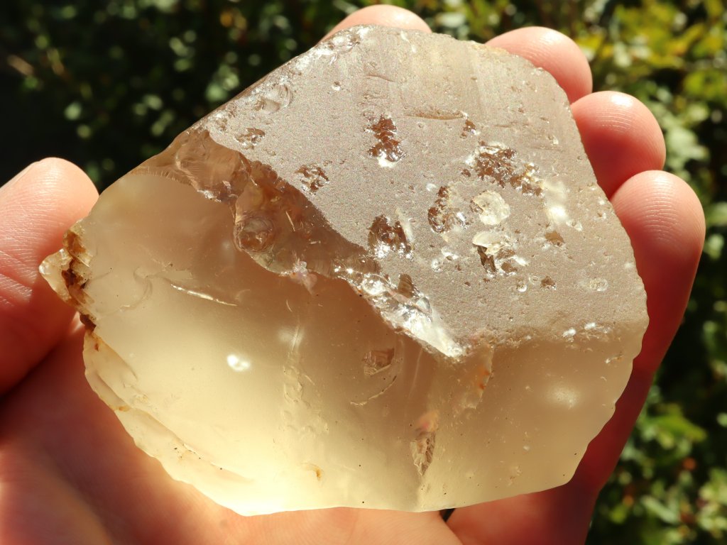 Při prosvícení kamene sluníčkem či baterkou sice nejde kvůli mírně omletému zevnějšku zcela nahlédnout do vnitřního světa citrínu, i přes to je však více než dobře patrné, že vzorek ukrývá především vysokou až drahokamovou čistotu s pouze malým množstvím mlhovin a peříček.