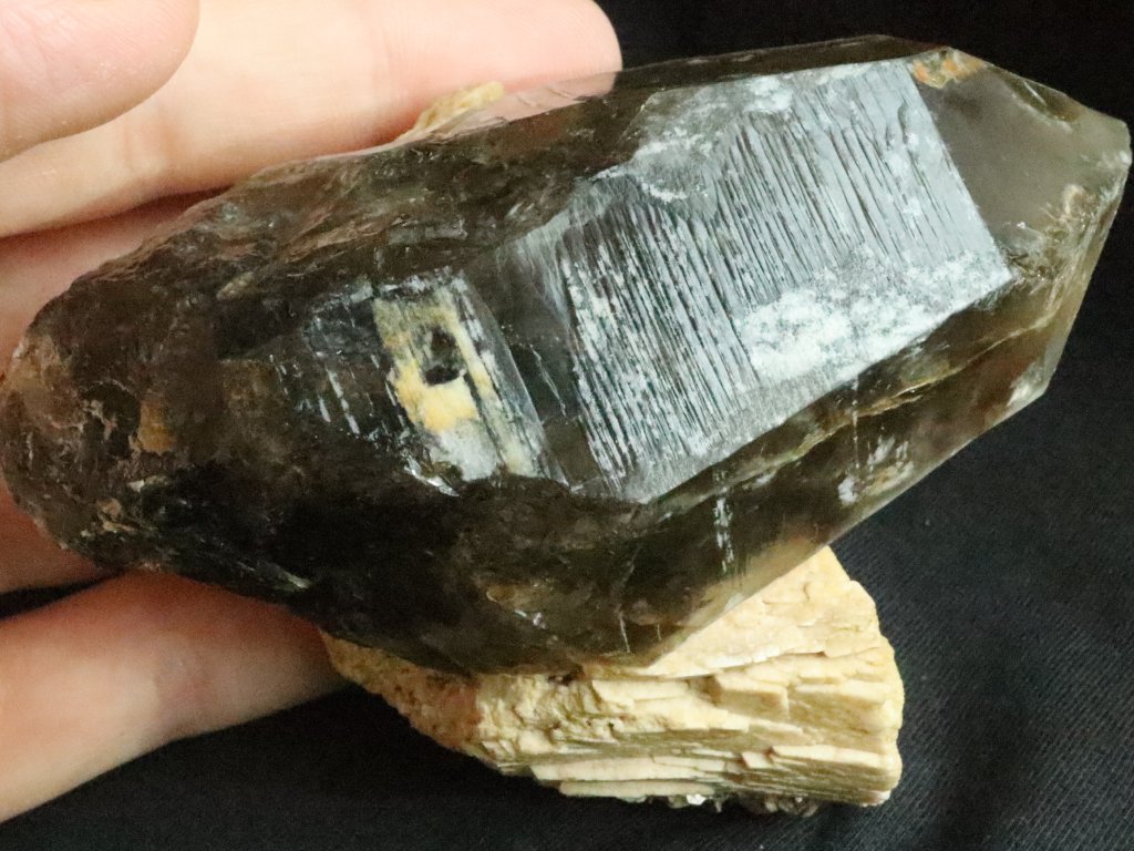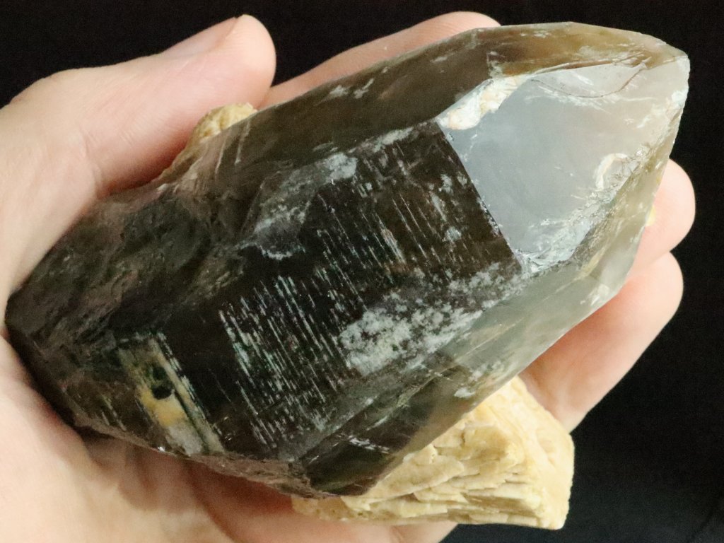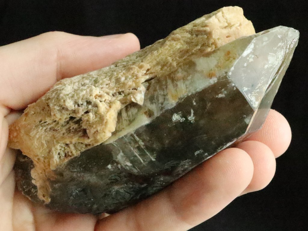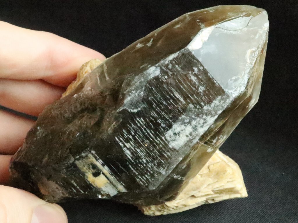 Z přední pohledové strany je krystal krásně vyvinutý a zachovalý, obdivovat tedy můžete jak obvodové stěny tak i samotnou špici. Jak už bylo zmíněno výše, zadní tzv. nepohledovou stranu záhnědy tvoří bílý až nažloutlý albit.