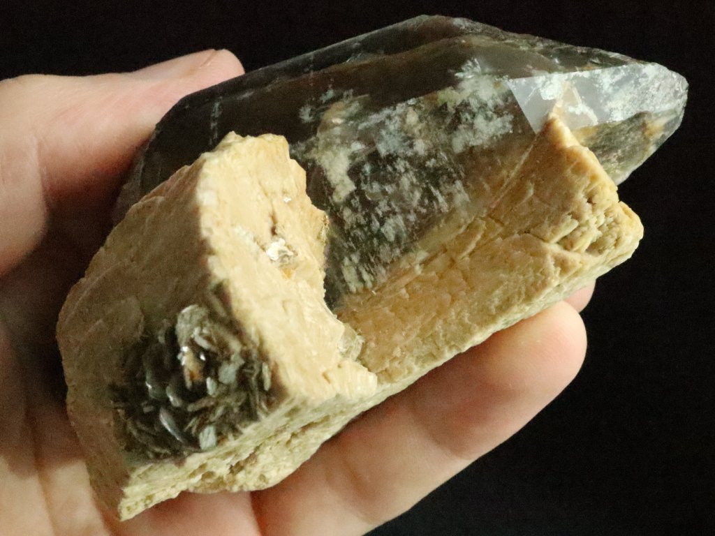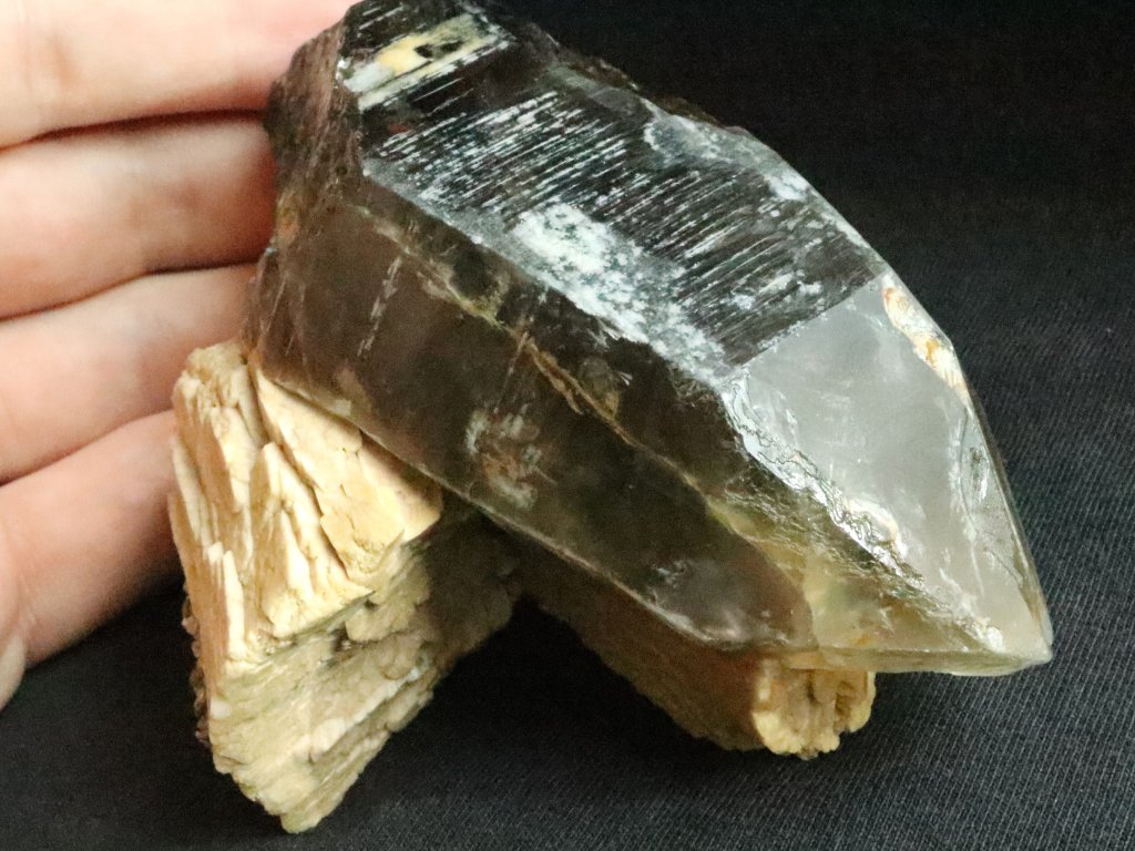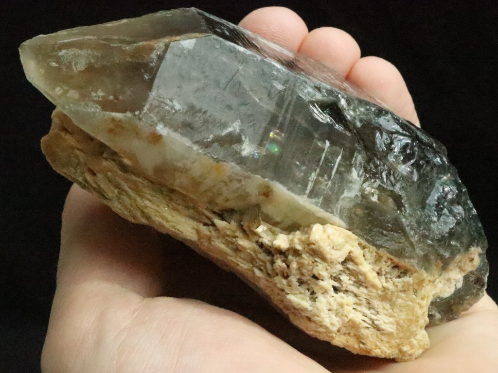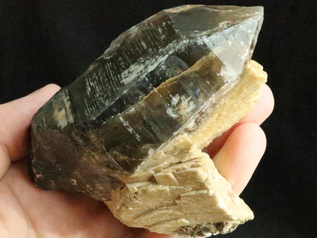 Z přední pohledové strany je krystal krásně vyvinutý a zachovalý, obdivovat tedy můžete jak obvodové stěny tak i samotnou špici. Jak už bylo zmíněno výše, zadní tzv. nepohledovou stranu záhnědy tvoří bílý až nažloutlý albit.