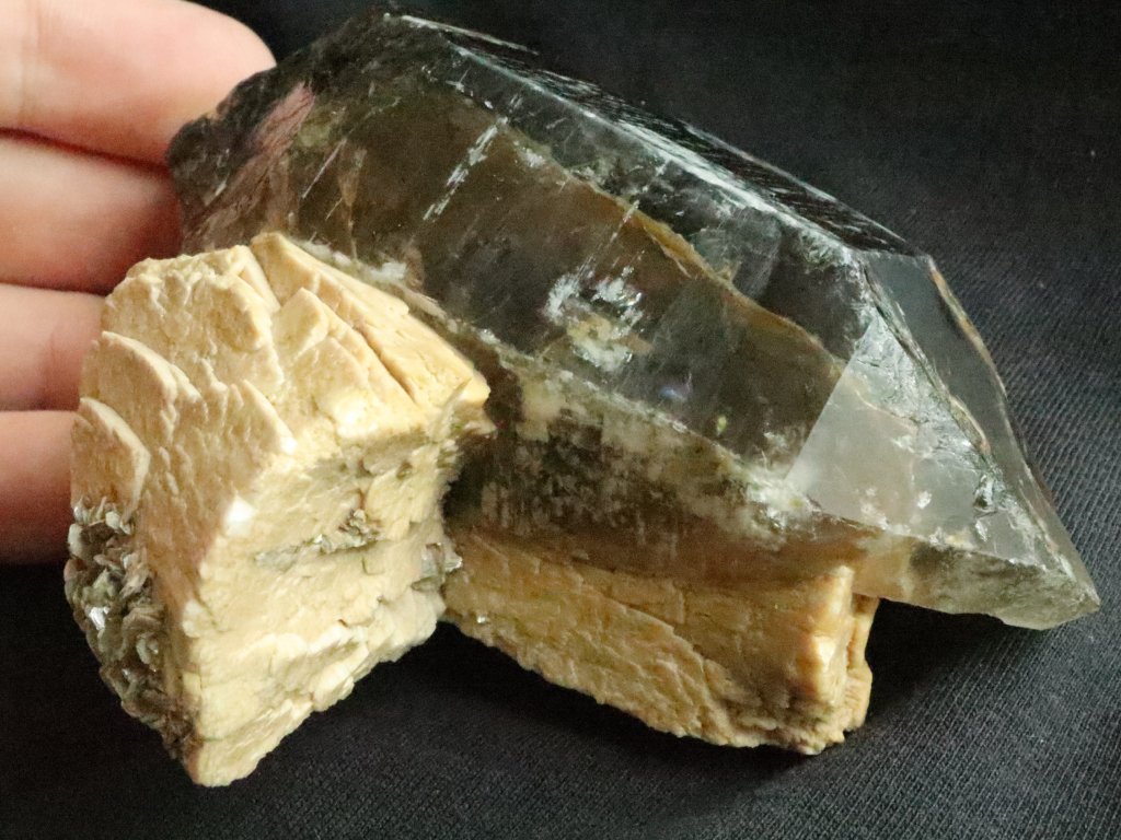 Větší krystal záhnědy narostlý na albitu - Vysočina