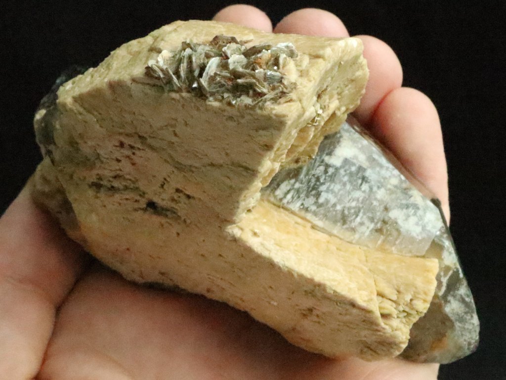 Nejde však o nějáký nevzhledný kus mateční horniny, albit je zde totiž moc hezky krystalovaný, tvoří tedy z části kostky / bloky. Navíc je v jedné pasáži zdobený shlukem stříbrně lesklých lupínků muskovitu (světlé slídy).