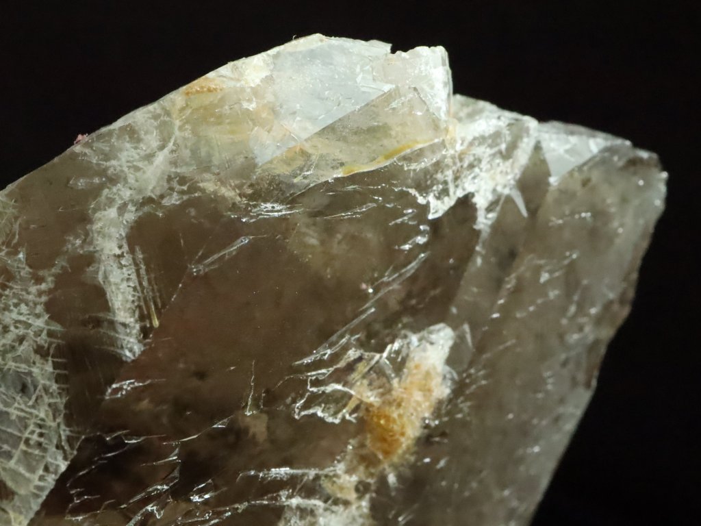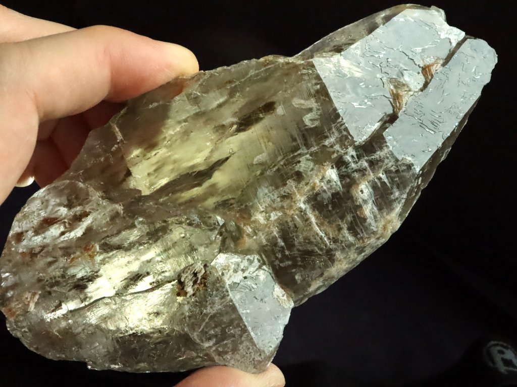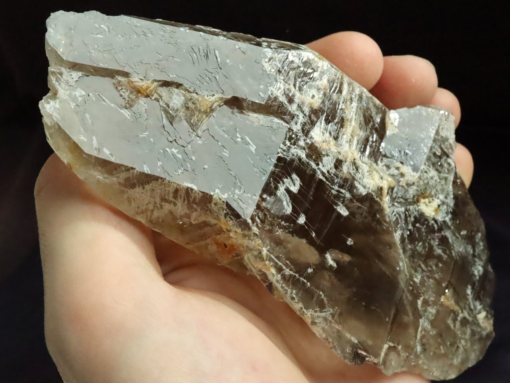 Celý krystal je sluníčkem či baterkou výborně průsvitný, lesklou pohledovou stranou pak můžete i solidně nahlédnout do vnitřního světa. Uvnitř najdete nejenom vysokou místy až drahokamovou čistotu, ale také hned několik mlhovin či větších peříček.