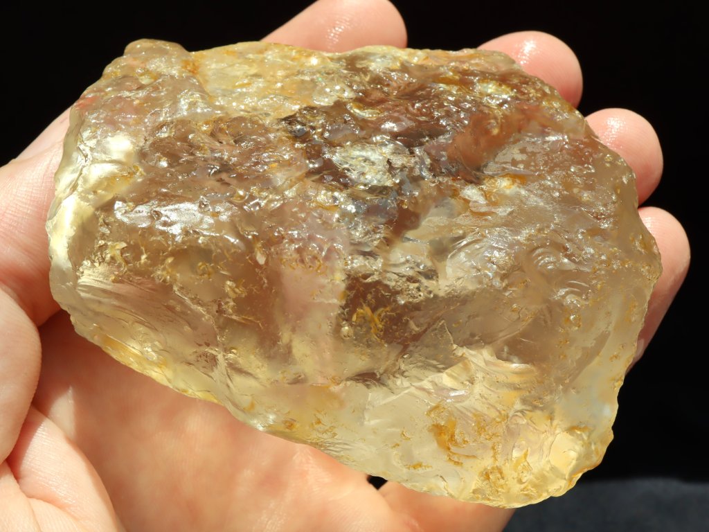 Při prosvícení citrínu sluníčkem či baterkou sice nelze kvůli tomuto mírně omletému zevnějšku nahlédnout zcela do vnitřního světa, i přes to je však dobře patrné, že valounek ukrývá až překvapivě vysokou (solidní) vnitřní čistotu. Částečně lze rozpoznat i větší peříčka či mlhovinové závoje.