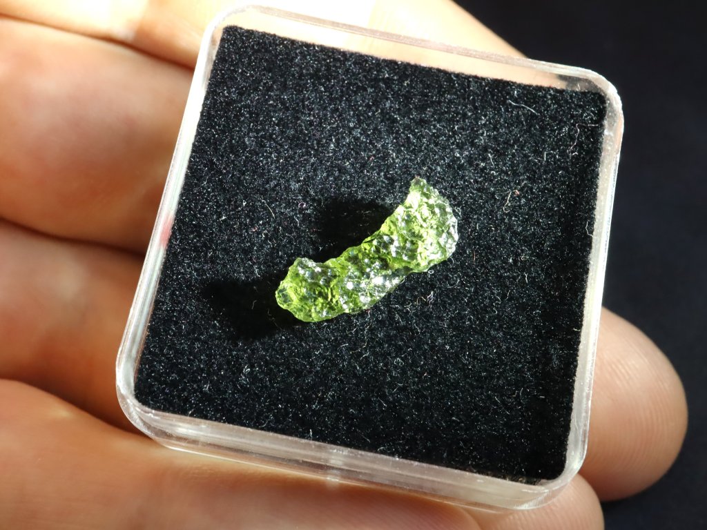 Vltavín obdržíte v kvalitní (hodnotné) uzaviratelné průhledné plastové krabičce s polstrovaným vnitřkem - viz. foto. Kamínek se vám tak nejen nikam nezatoulá, ale zároveň se jím budete moci přes průhledné plastové víčko krabičky i skvěle kochat.