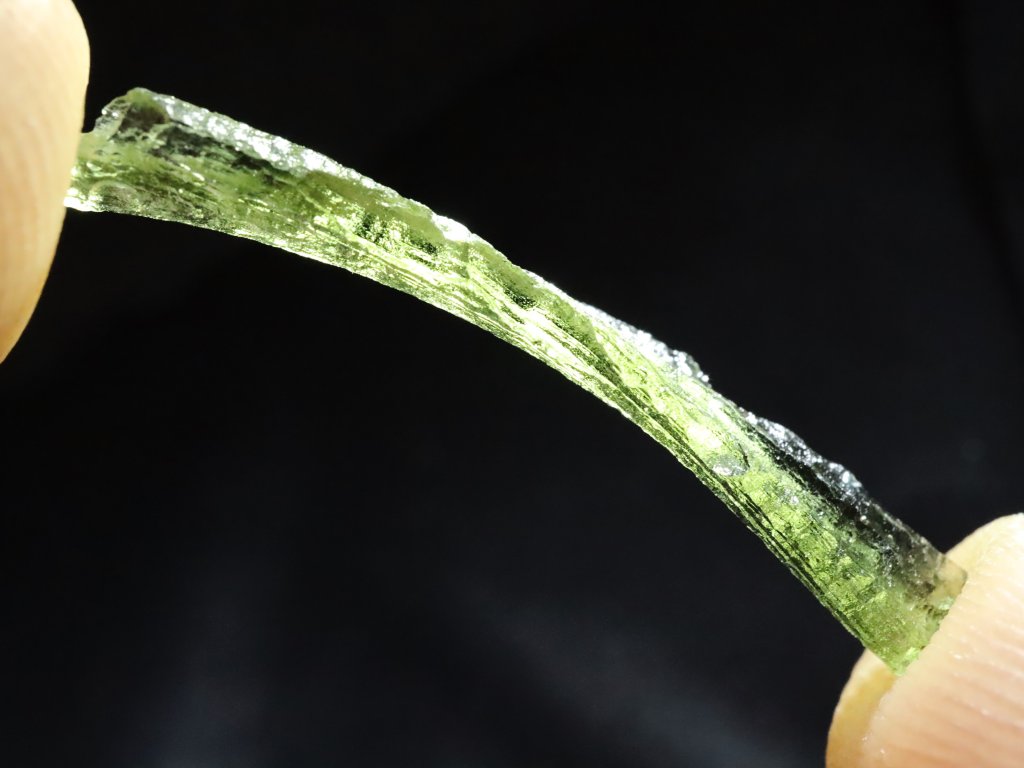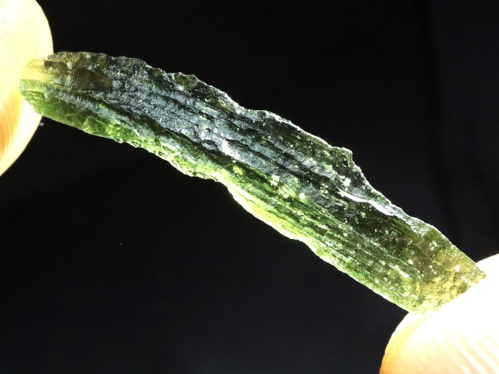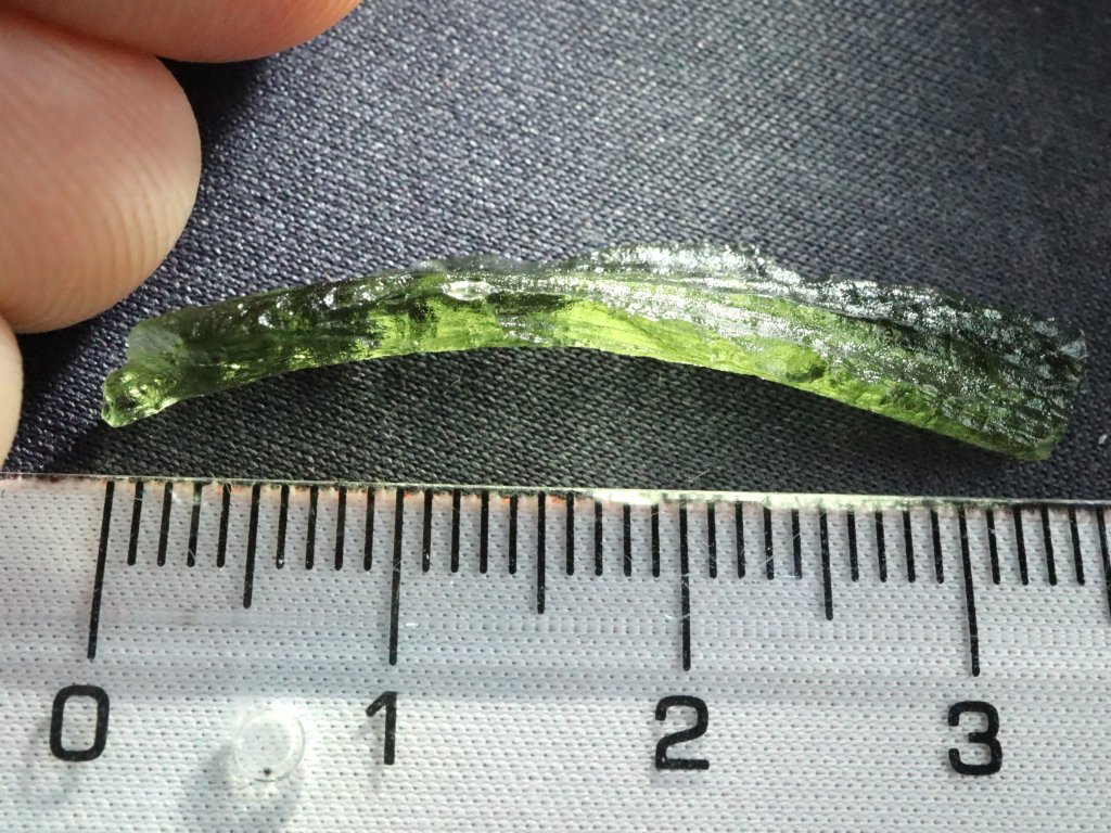 Pravý přírodní vltavín (moldavit) s váhou 0,88 gramu, pocházející z oblasti jižních Čech.