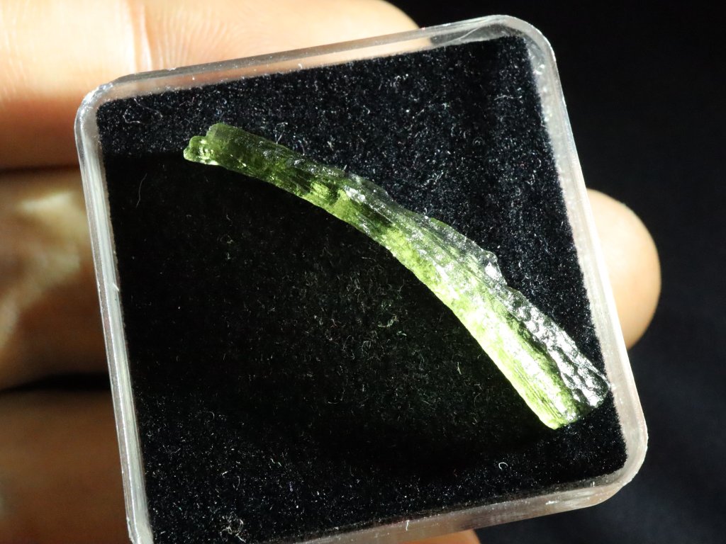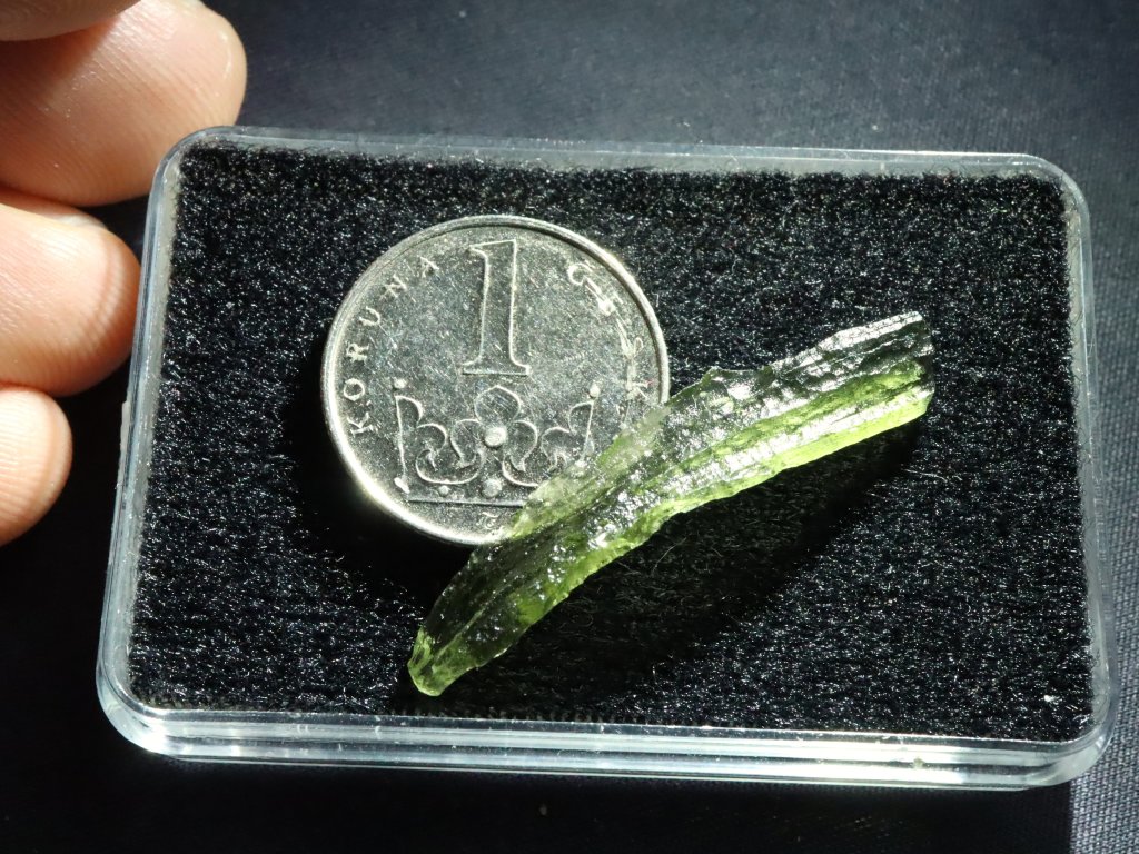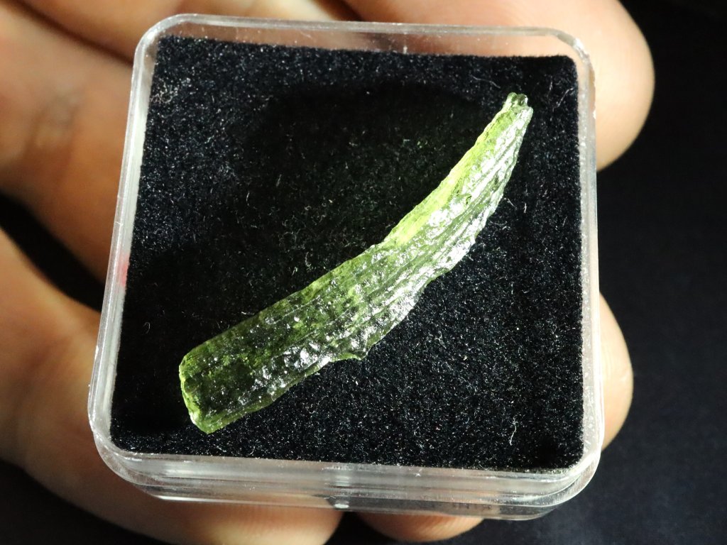 Vltavín obdržíte v kvalitní (hodnotné) uzaviratelné průhledné plastové krabičce s polstrovaným vnitřkem - viz. foto. Kamínek se vám tak nejen nikam nezatoulá, ale zároveň se jím budete moci přes průhledné plastové víčko krabičky i skvěle kochat.