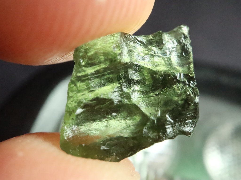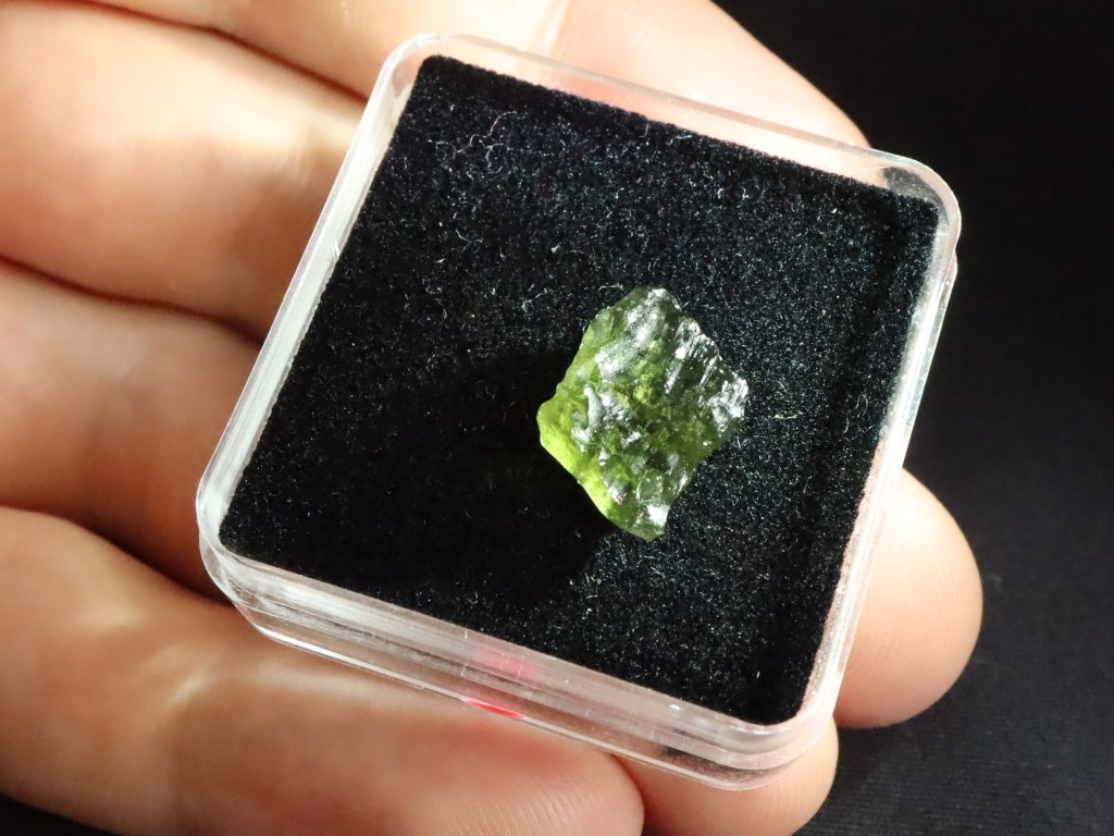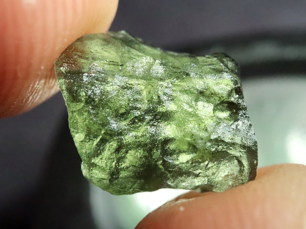 Pravý přírodní vltavín s váhou 0,75 gramu, nalezený v oblasti jižních Čech.