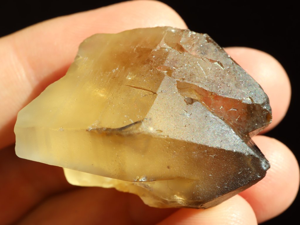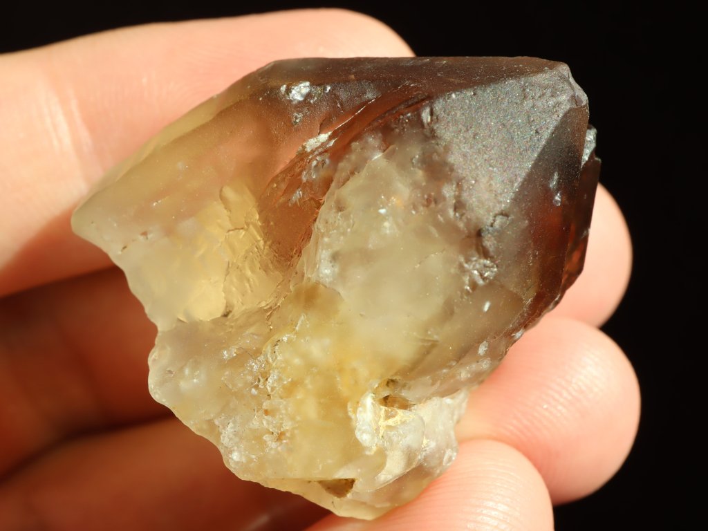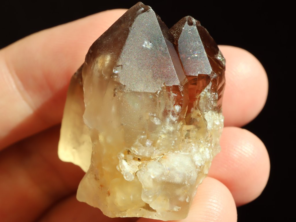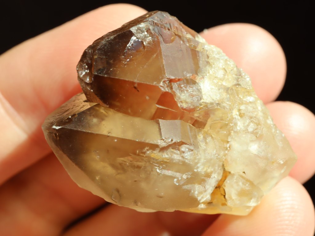Tato citrínová srostlička se však na sluníčku může pochlubit i úžasným a podmanivým středně žlutým odstínem s tmavšími špičkami - Toto ojedinělé zbarvení kdy mají krystaly citrínů tmavé až černé špičky, je typické pro vyjímečnou citrínovou lokalitu Kněževes - Přečtěte si více o tomto unikátním nalezišti v samostatném článku níže.