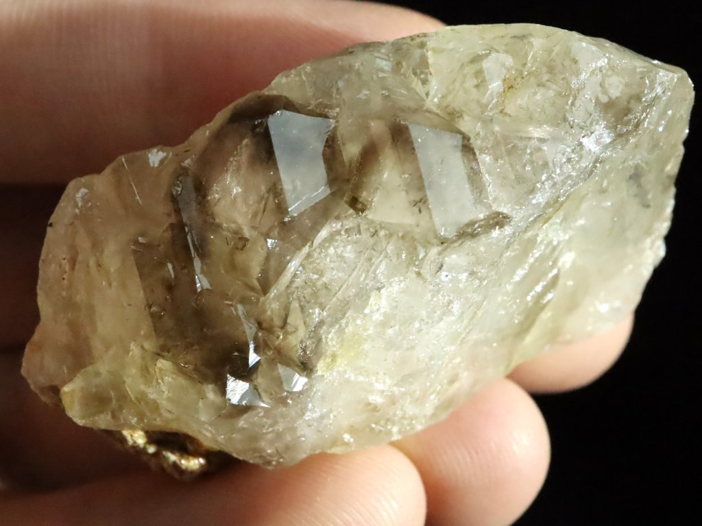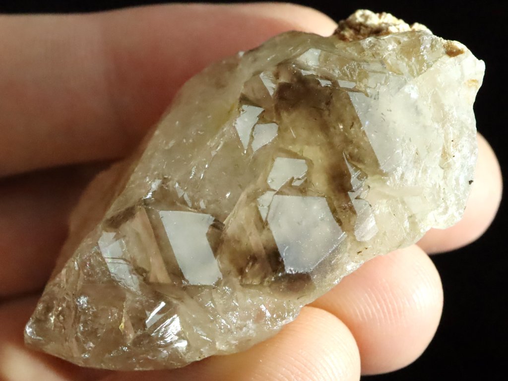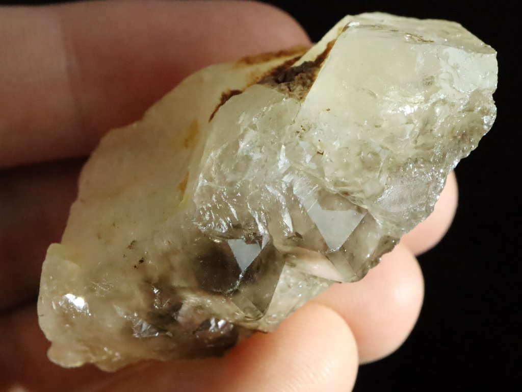 Na křemeni se pak můžete kochat hezkou ukázkou kouřové záhnědy, která se pyšní krásným náznakem tzv. elestiálního neboli stupňovitého růstu.
