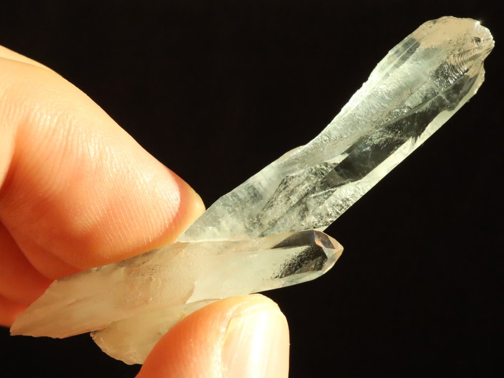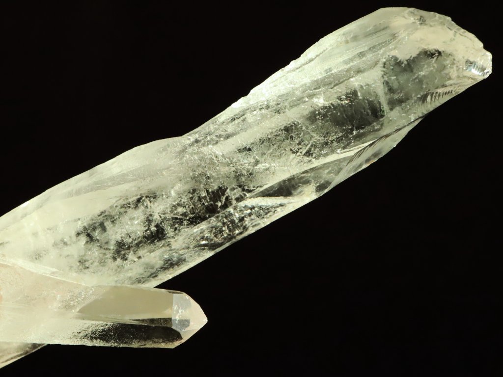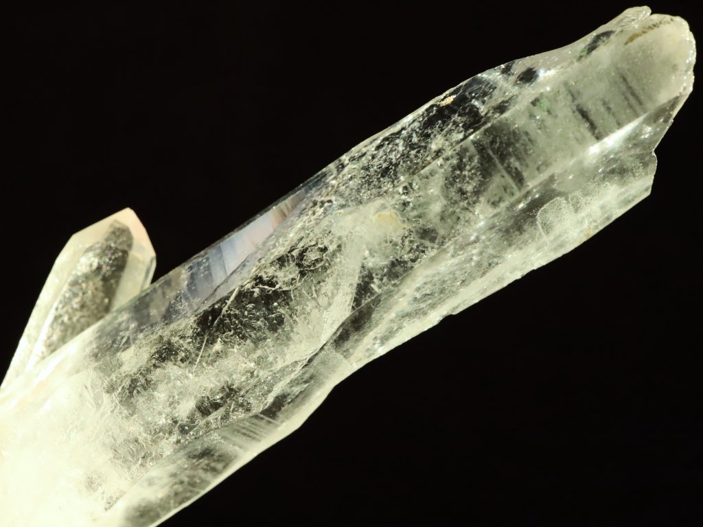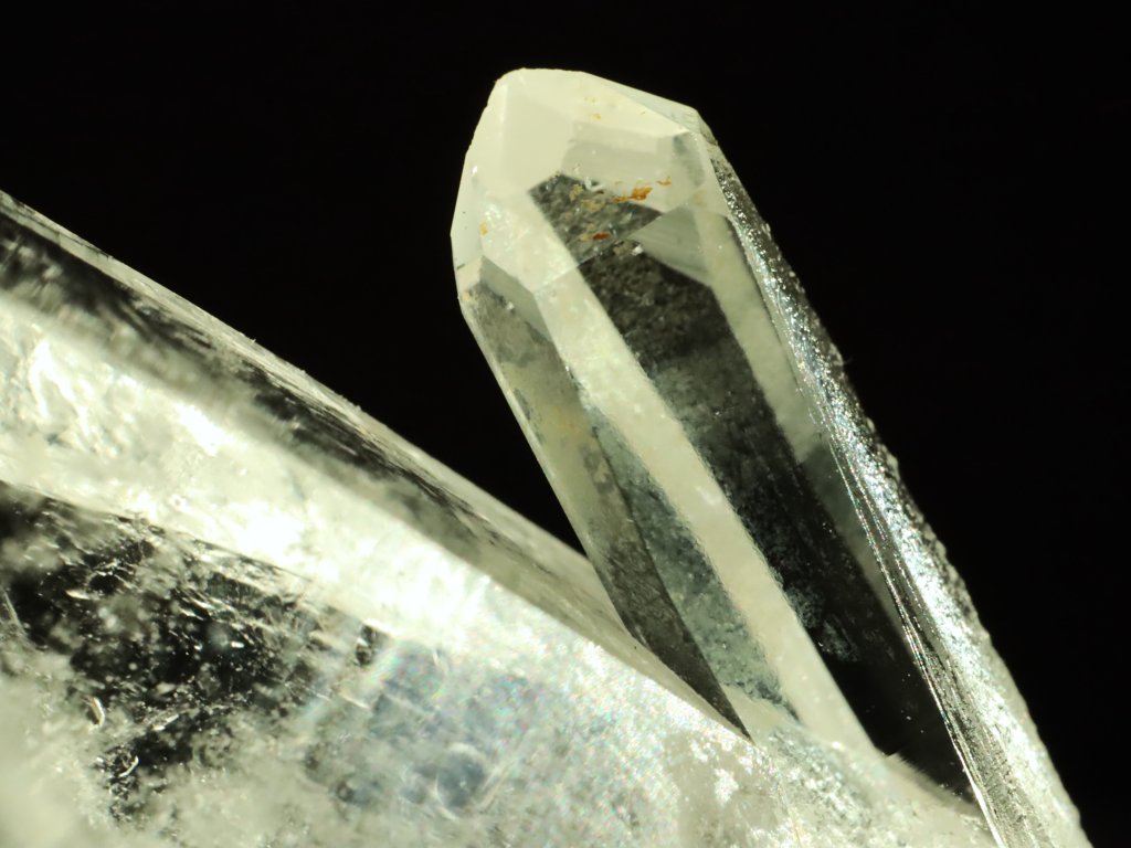 Dominantní krystal je převážně lesklý a uvnitř má vysokou až drahokamovou čistotu, menší krystalek je až na špičku mírně zakalený mléčným křemenem.